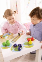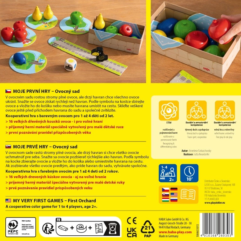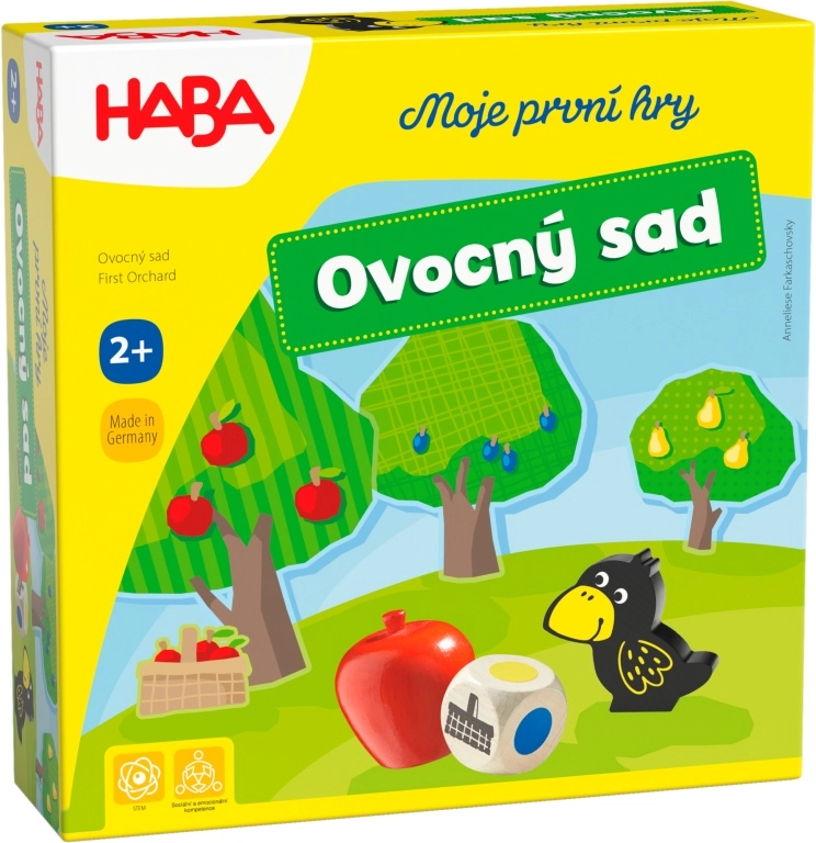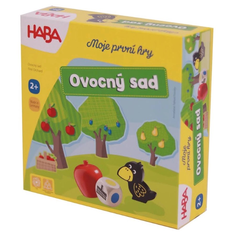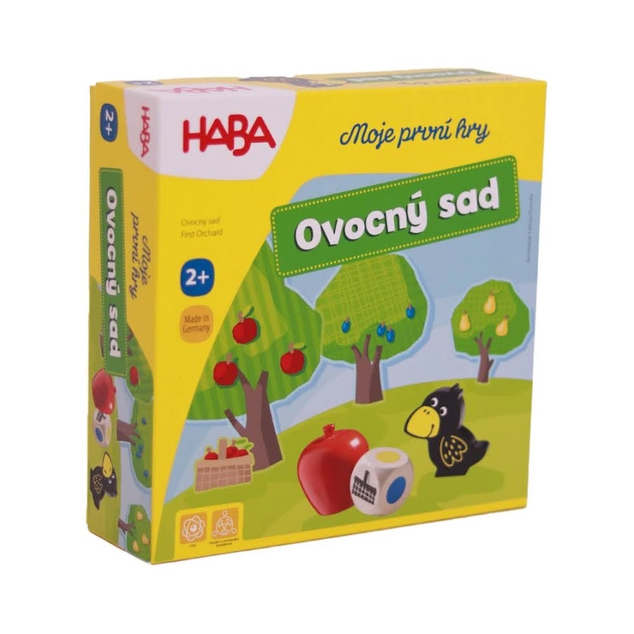 Kooperativna otroška igra Haba Moje prve igre: Sad z sadjem uči najmlajše sodelovanja, barv in preprostih pravil. Skupaj oberite sadje z dreves prej, kot prispe vrana – če vam uspe, vsi zmagate. Idealno za 1–4 igralce in kratko igro okoli 10 minut.