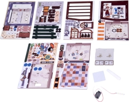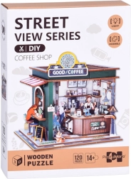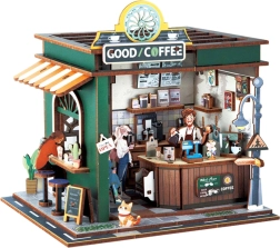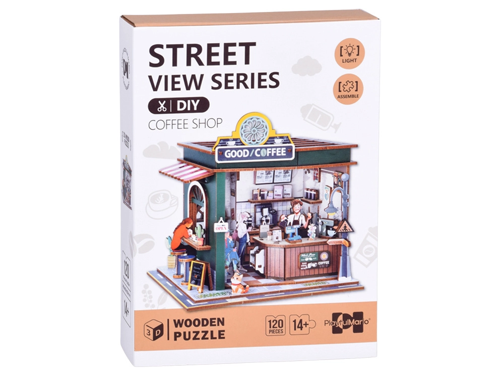 Ta podrobna sestavljanka iz serije Street View spremeni ravne plošče v stilno mini kavarno z izložbo, barom in dodatki. Odprta zasnova omogoča pogled v notranjost in občudovanje polic, kavomata ter drobnih dekoracij. LED trak po temi ustvari prijetno, domačno vzdušje, model pa izstopa kot okras na polici ali pisalni mizi.