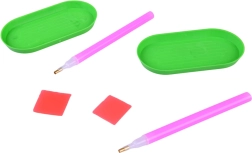 Dva pladnja z utori, dve aplikacijski peresi in dva voska poskrbijo za natančno in udobno polaganje kamenčkov – idealno za otroke in začetnike.