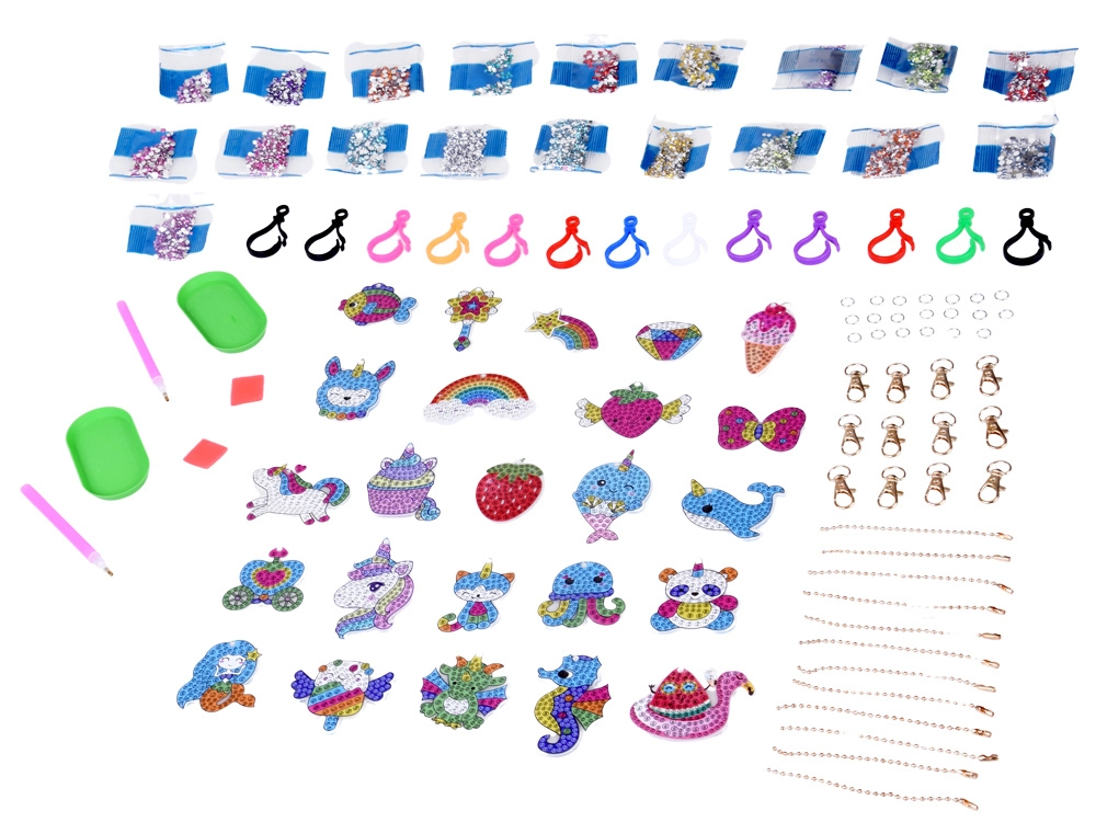 Najdete prikupne motive, kot so samorog, mavrica z oblački, lama, morski konjiček, kit ter sadje in slaščice. Gotove obeske lahko obesite na kovinske kroglične verižice ali plastične sponke. Vsakodnevni mini projekt prinese otrokom veselje ob dokončanem izdelku in krepi njihovo samozavest.