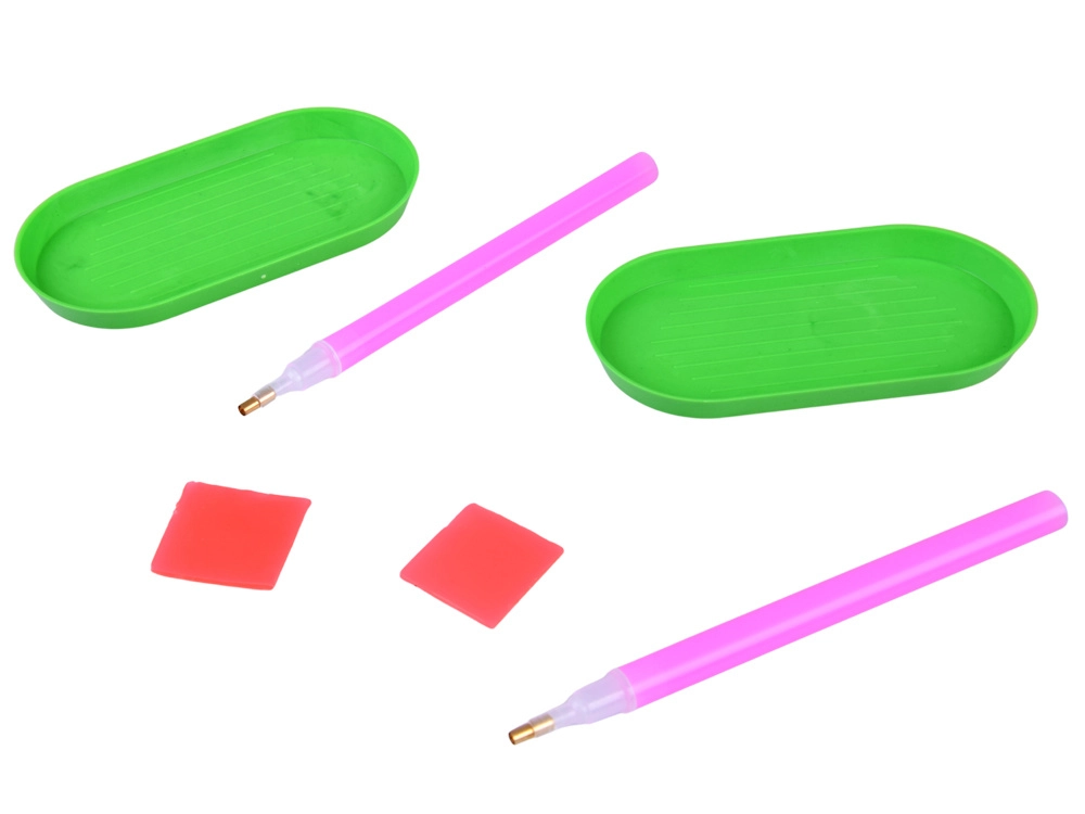 Dva pladnja, dve aplikacijski pisali s kovinsko konico in voskaste blazinice olajšajo zajemanje ter natančno polaganje kamenčkov – čisto in brez nereda.