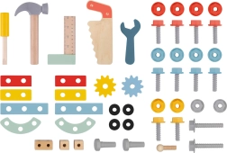 Z gumiranimi trakovi na kolesih je vožnja tiha in prijazna do tal. Ergonomski ročaj lepo sede v otroško roko, zadnja škatla za orodje pa sprejme vse sestavne dele. Priložen je bogat komplet lesenih orodij in pritrdilnega materiala za neskončne gradbene različice.