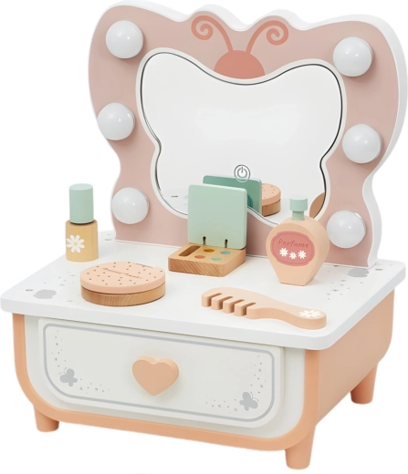 Prisrčna lesena toaletna mizica TOOKY TOY z metuljastim ogledalom in LED osvetlitvijo spremeni otroško sobo v lepotni salon. Vsebuje bogat komplet dodatkov za vlogo vizažistke in frizerke, vključno s sušilnikom za lase, glavničkom, šminko in parfumom. Zaradi varnih lesenih dodatkov, praktičnega predala in treh svetlobnih načinov je idealna za ustvarjalno igro ter razvoj fine motorike in domišljije otrok od 3 let dalje.