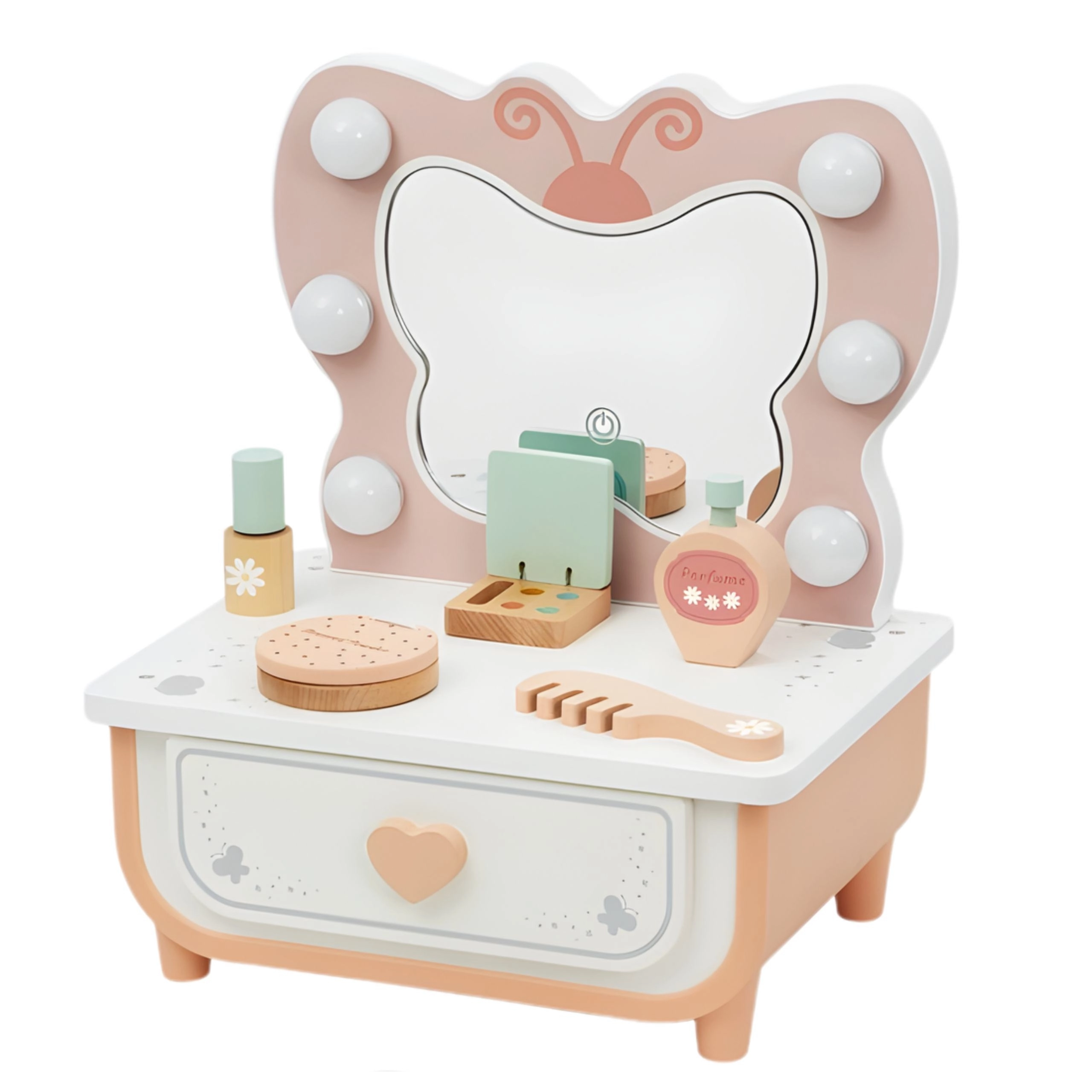 Otroška lesena toaletna mizica z metuljastim ogledalom in LED “žarnicami” prinaša čaroben prostor za domiselno igro. Elegantne pastelne barve se lepo podajo v vsak interier, medtem ko so trpežni leseni deli prijetni na otip in varni za male vizažistke.