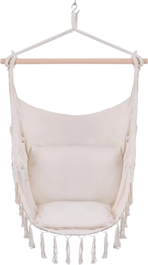 Sprostite se po napornem dnevu v udobnem visečem stolu LUA v elegantni bež barvi. Trpežna polibombažna tkanina z gramatura 320 gsm je prijetna na dotik in hkrati odporna proti obrabi. Lesena prečka dolžine 91 cm zagotavlja stabilnost in pravilno razporeditev teže, zato boste uživali v udobnem guganju in opori za hrbet.