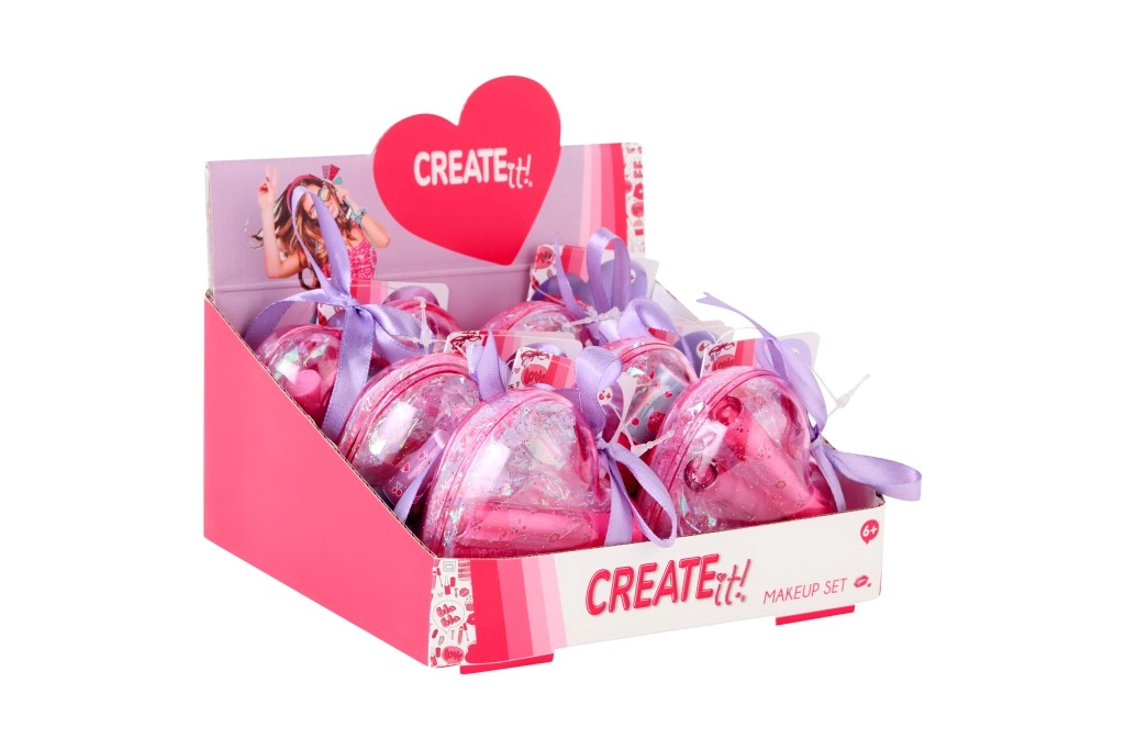 Odkrijte čar ličenja za otroke s setom CREATE IT! v ljubkem srčkastem etuiju. Prozoren rožnat ovitek z bleščicami in praktičnim trakom nudi varno shranjevanje kozmetike in se odlično prilega v nahrbtnik ali toaletko. Vsak komplet je zasnovan za veselje ob ustvarjalnosti in enostavno uporabo.