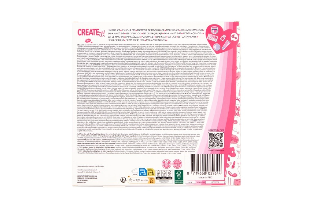 Zabaven otroški komplet ličil CREATE IT! v barvah Lila Turquoise bo razveselil male modne navdušenke od 6. leta dalje. Vsebuje vse za ustvarjalno igranje: 2 laka za nohte, balzam za ustnice, šminko, komplet 6 bleščečih senčil za oči, kredo za lase in čopiče za enostaven nanos.