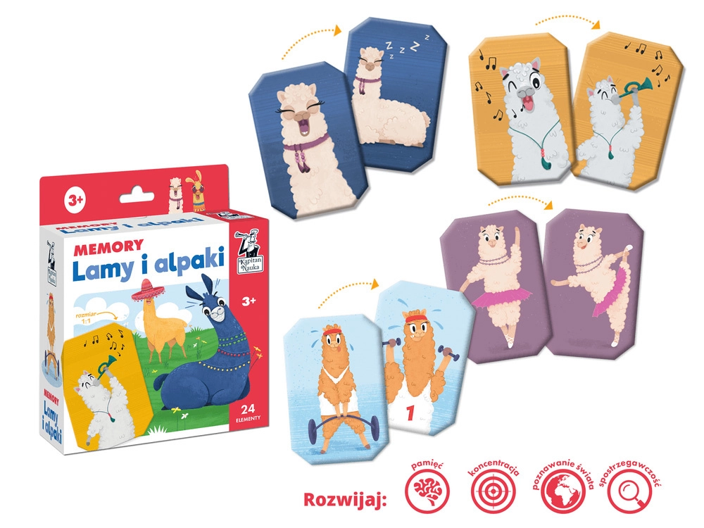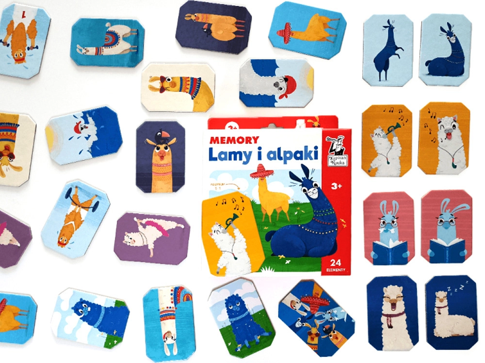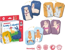 Zabavne spominske kartice z motivi prijaznih lam in alpak za otroke od 3 let. Igra razvija spomin, pozornost in zbranost pri iskanju parov. Paket vsebuje 24 kartic (12 parov) velikosti približno 9 × 6 cm z veselimi ilustracijami – balerina, glasbenik, pirat in drugi.