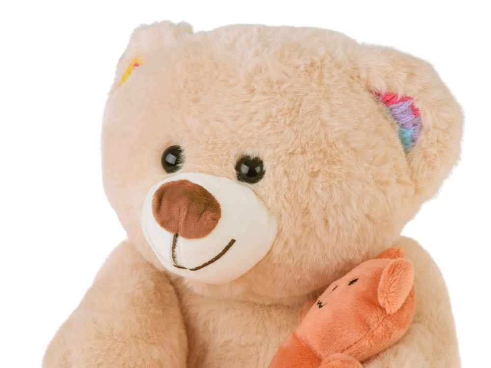 Bež plišast medvedek z izvezenim nasmehom drži malega oranžnega medvedka – ljubek duet, ki ga bodo otroci takoj vzljubili.