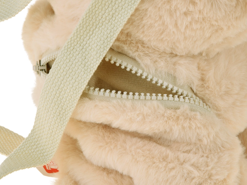 Ta mehak nahrbtnik v obliki bež medvedka združuje igračo in praktično prtljago v enem. Barviti detajli na tačkah in ušesih, izvezen nasmeh ter prijetno kosmatna površina spodbujajo otroško domišljijo in udobje pri nošenju. Skriti žep na zadrgo sprejme drobne zaklade, malico ali robčke.