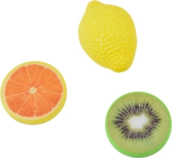 Barviti plastični plodovi – limona, kivi in pomaranča – spodbujajo domišljijo in raznolike kuharske scenarije.