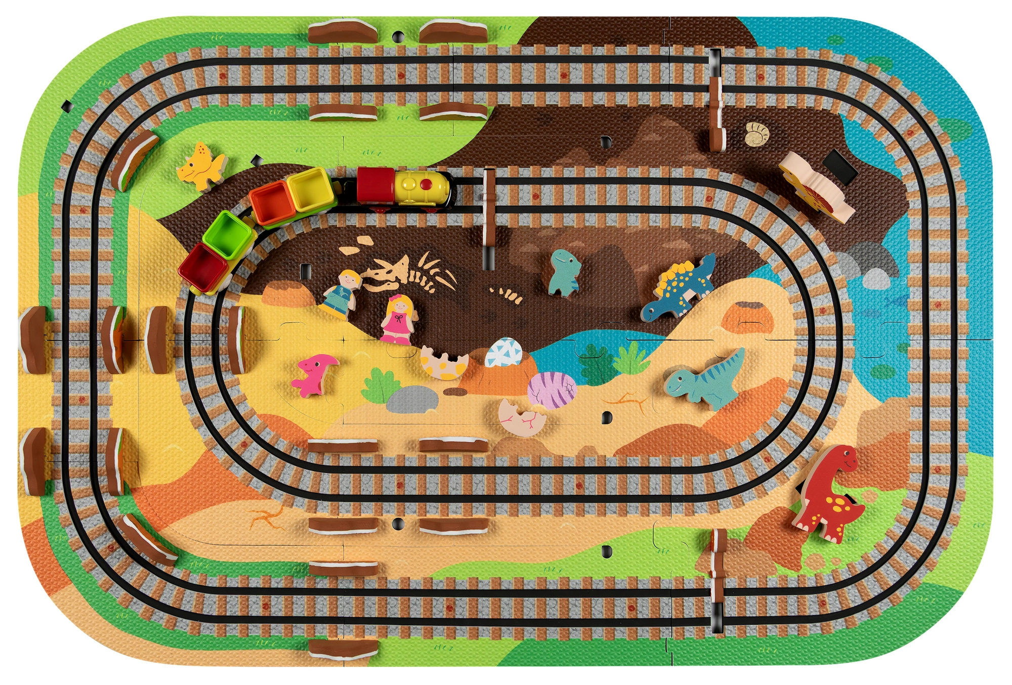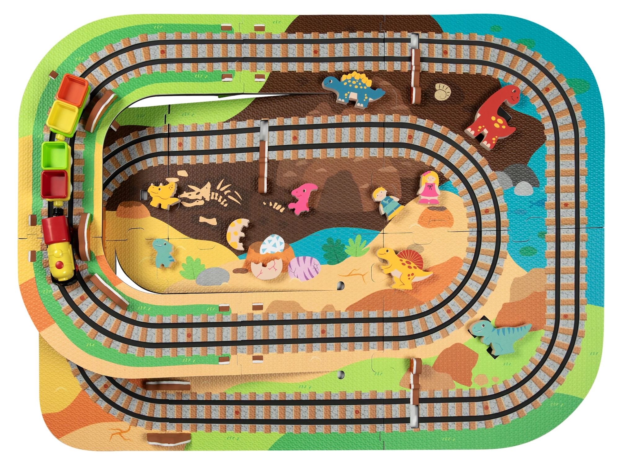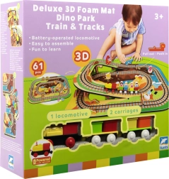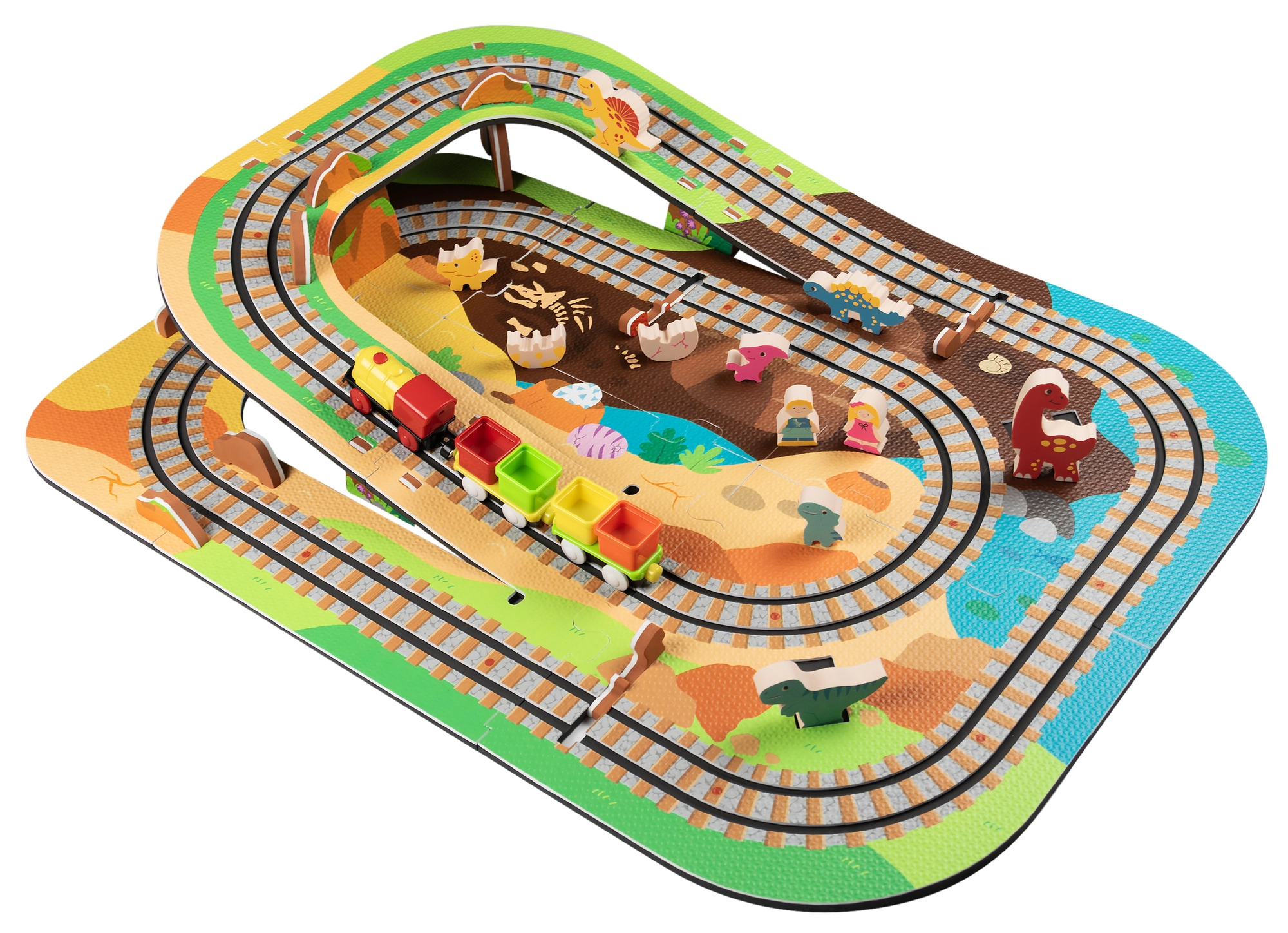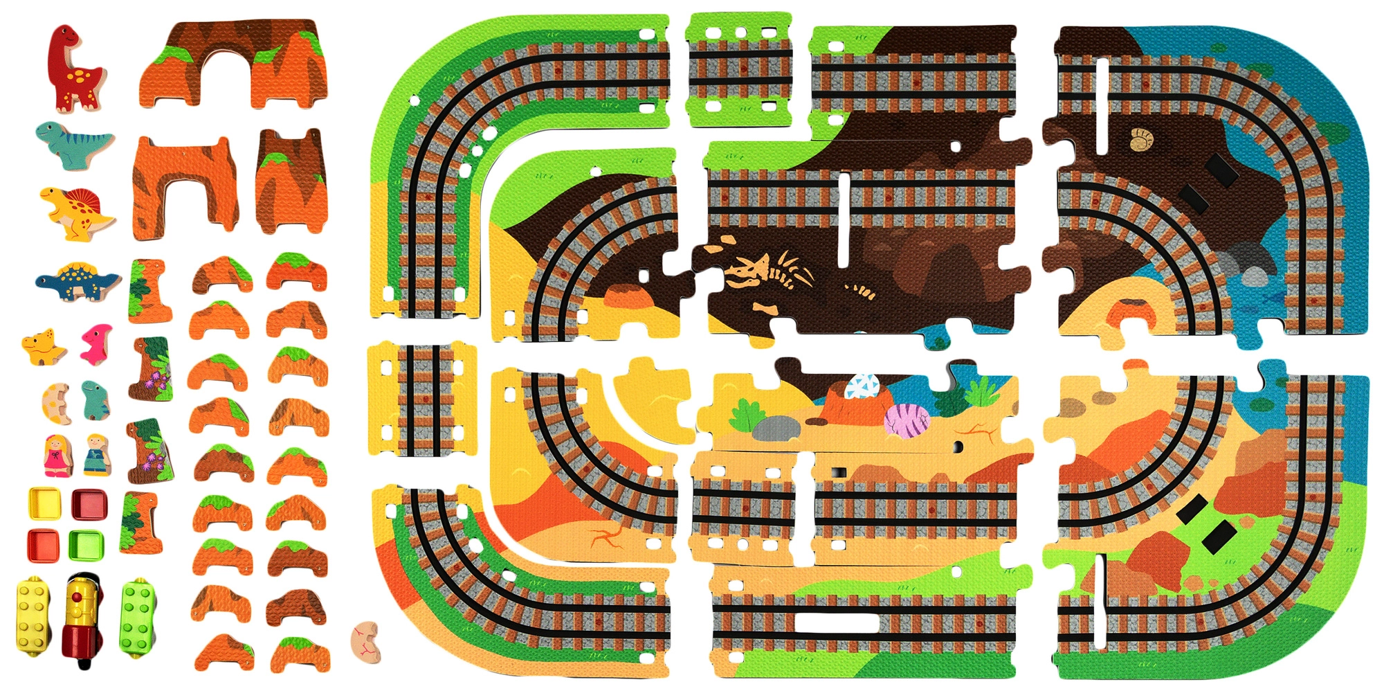 Ta ustvarjalni komplet združuje penaste puzzle iz EVA z motivom dinozavrov in železniško progo za vlakec. Deli se preprosto zaskočijo in omogočajo gradnjo ravnin in strmih vzponov. Lokomotiva z vagoni (na baterije) se po progi gladko premika, otroci pa lahko igro obogatijo z lesenimi/penastimi figuricami dinozavrov, skalami in tuneli.