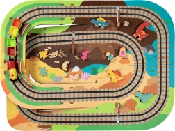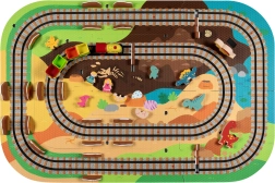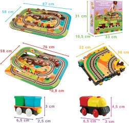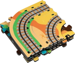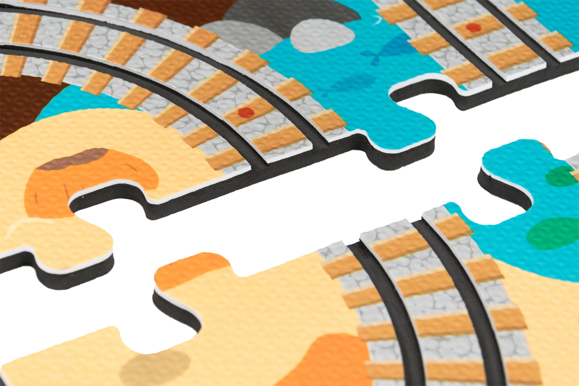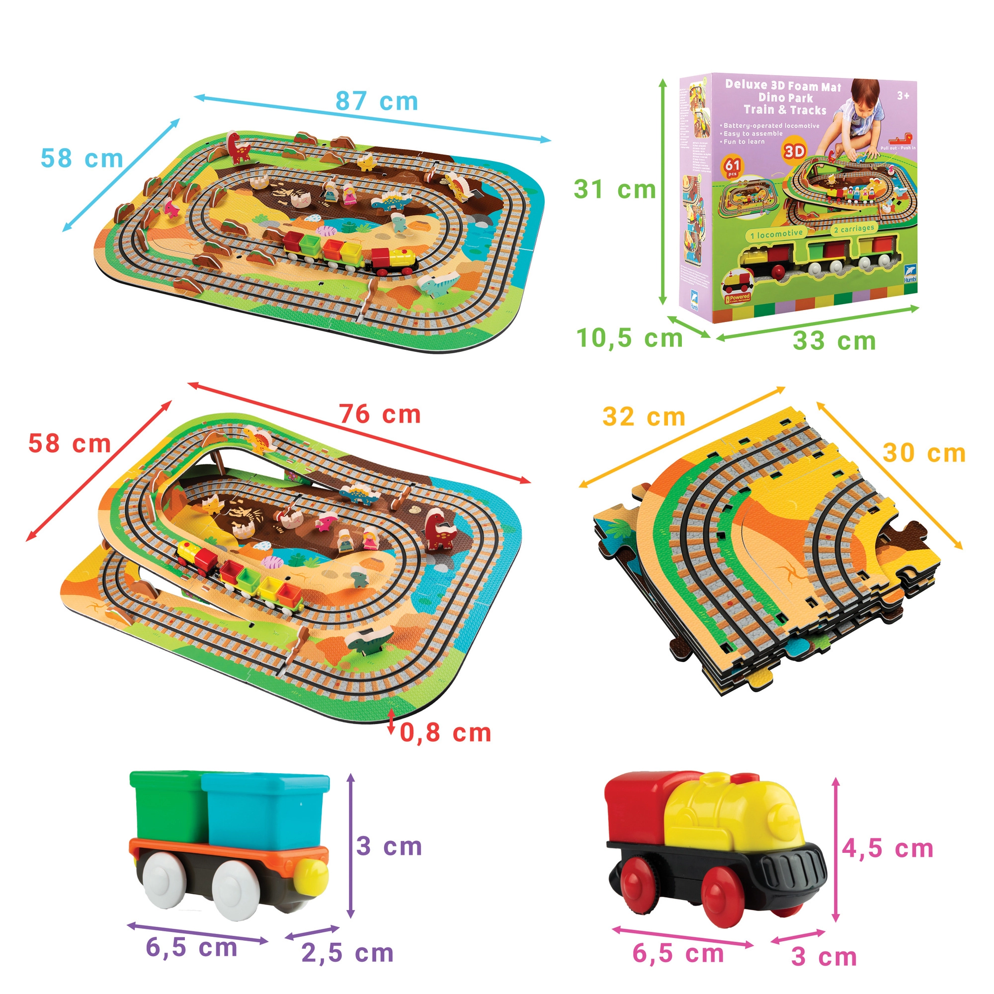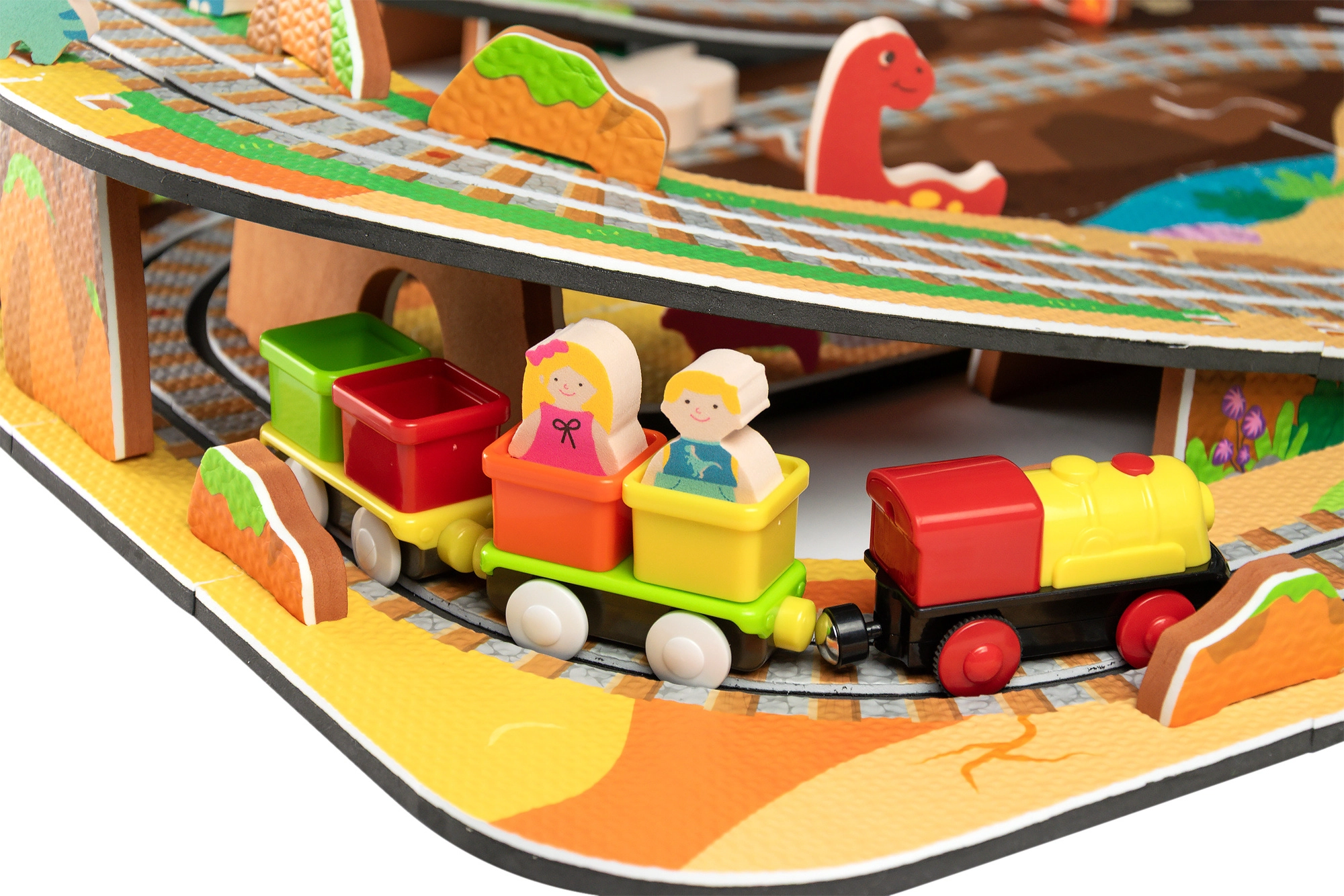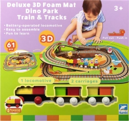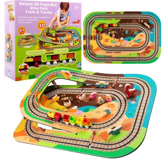 Ta ustvarjalni komplet združuje penaste puzzle iz EVA z motivom dinozavrov in železniško progo za vlakec. Deli se preprosto zaskočijo in omogočajo gradnjo ravnin in strmih vzponov. Lokomotiva z vagoni (na baterije) se po progi gladko premika, otroci pa lahko igro obogatijo z lesenimi/penastimi figuricami dinozavrov, skalami in tuneli.