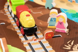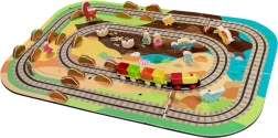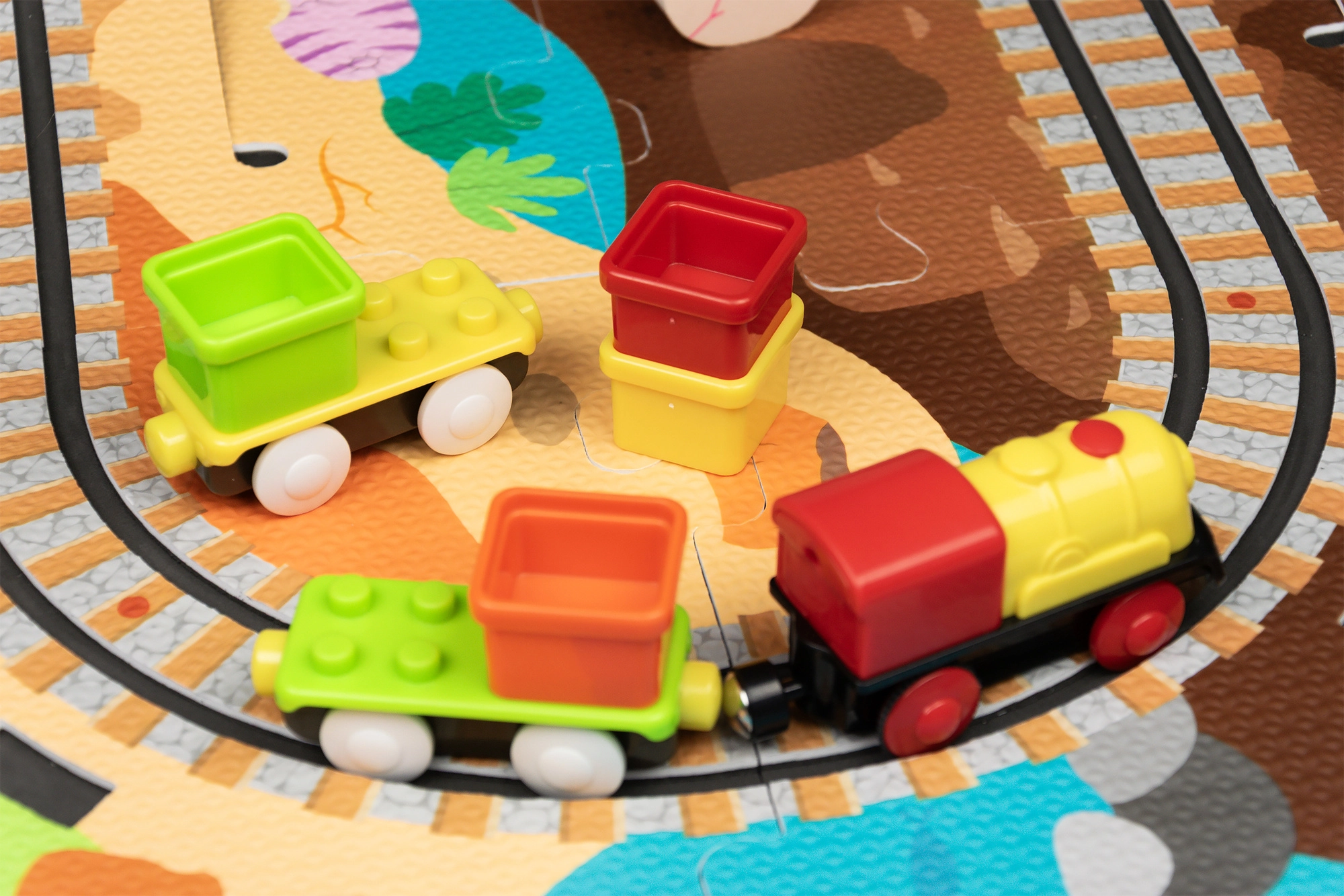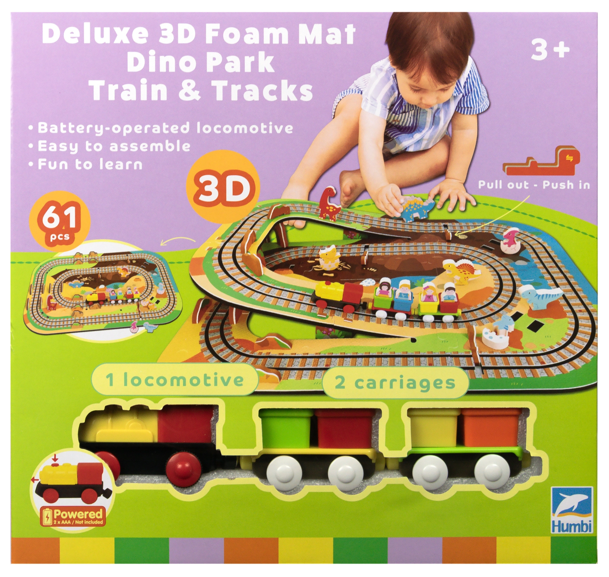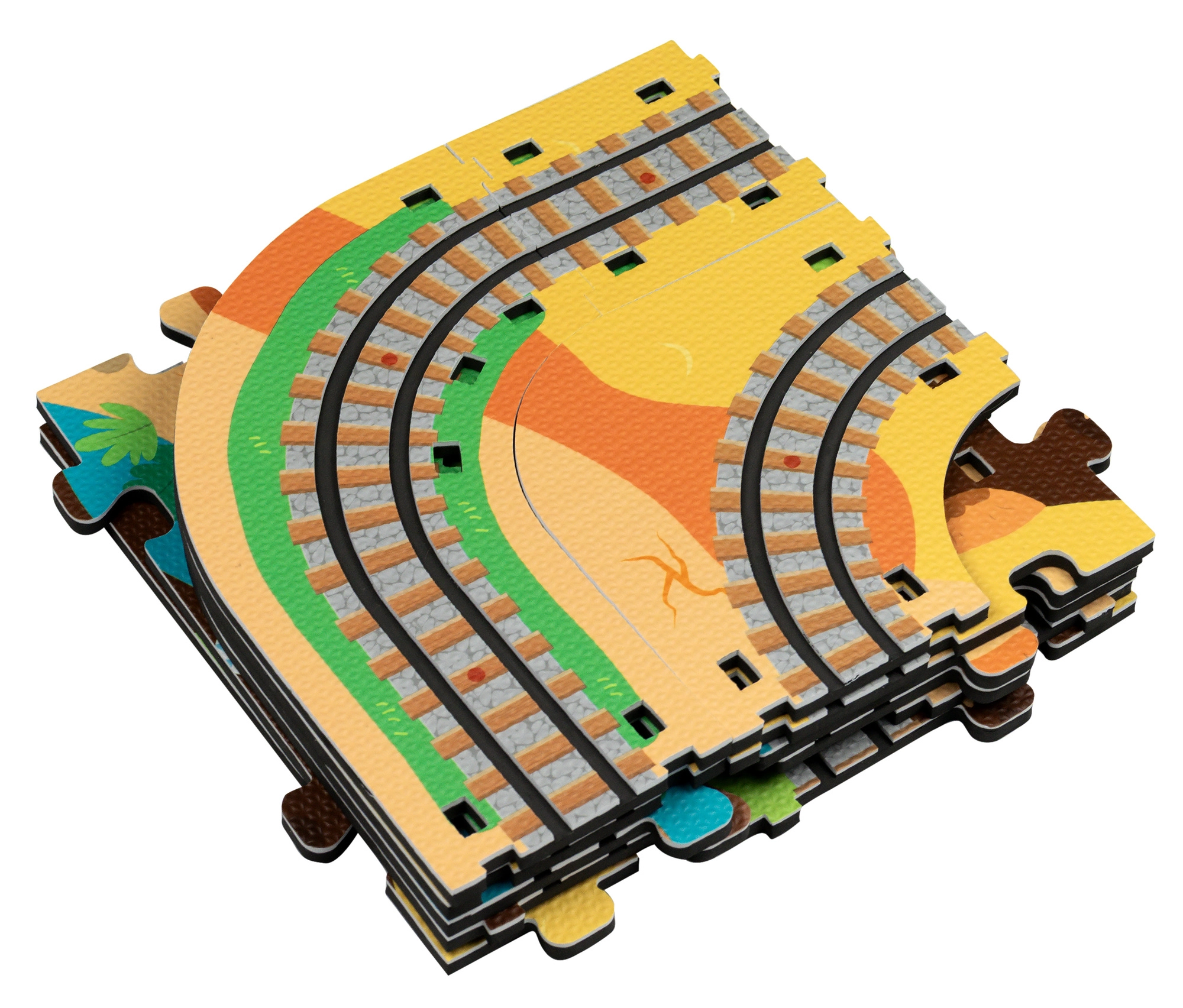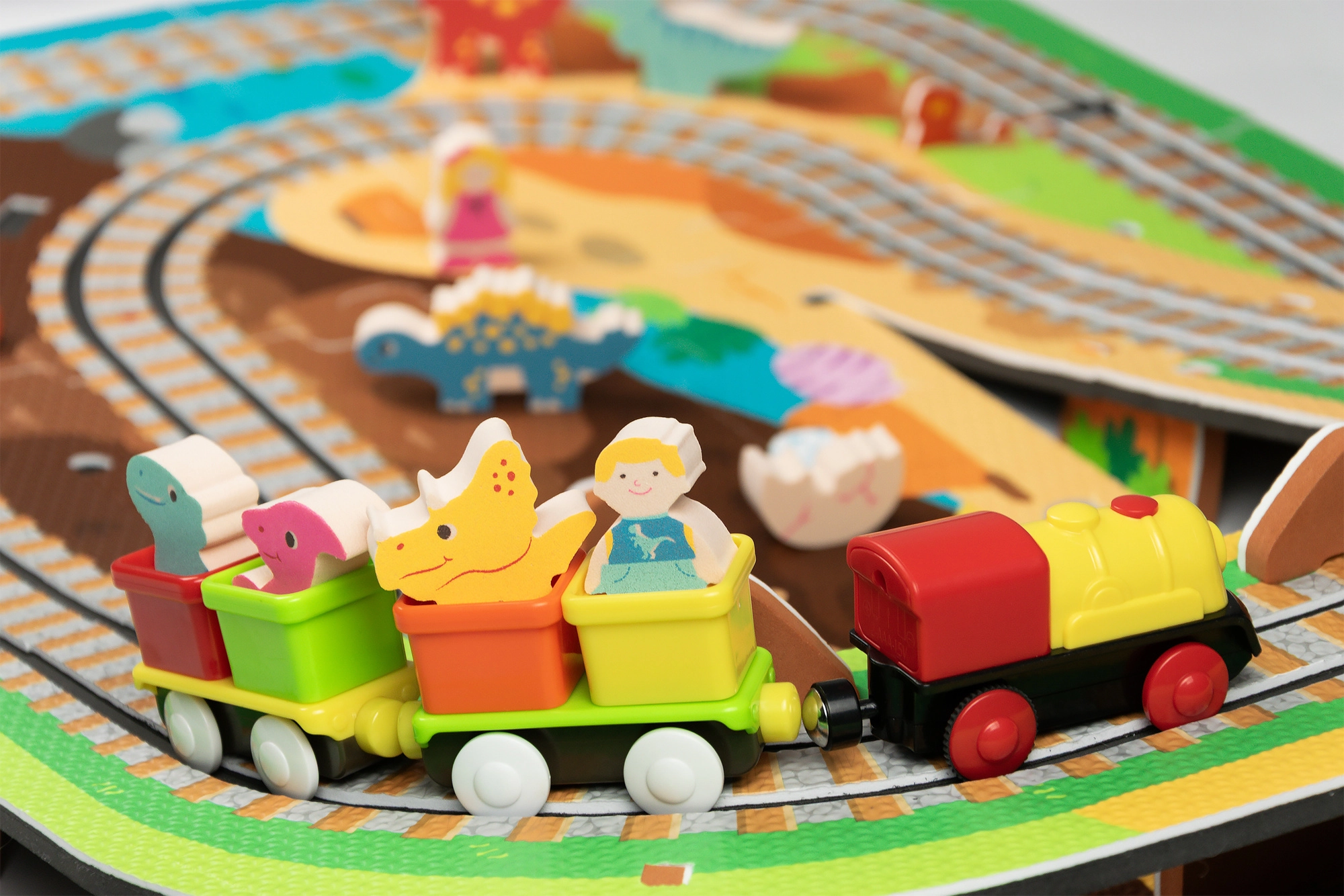 Ta ustvarjalni komplet združuje penaste puzzle iz EVA z motivom dinozavrov in železniško progo za vlakec. Deli se preprosto zaskočijo in omogočajo gradnjo ravnin in strmih vzponov. Lokomotiva z vagoni (na baterije) se po progi gladko premika, otroci pa lahko igro obogatijo z lesenimi/penastimi figuricami dinozavrov, skalami in tuneli.