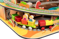 Vsebina vključuje 12 kosov tirov, 42 tematskih dodatkov in praktične škatlice za vagone za prevoz potnikov ali drobnarij. Mehki, vzdržljiv in brez vonja material EVA zagotavlja udobno in varno igro. Izdelek izpolnjuje standarde EN 71, RoHS 2011/65/EU in ima oznako CE.