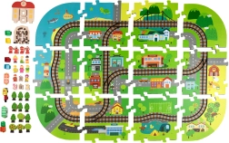 Povežite dele kot sestavljanko in ustvarite svoje mesto z ulicami, tiri, stavbami in naravo. Trdni EVA deli držijo obliko in se enostavno čistijo.