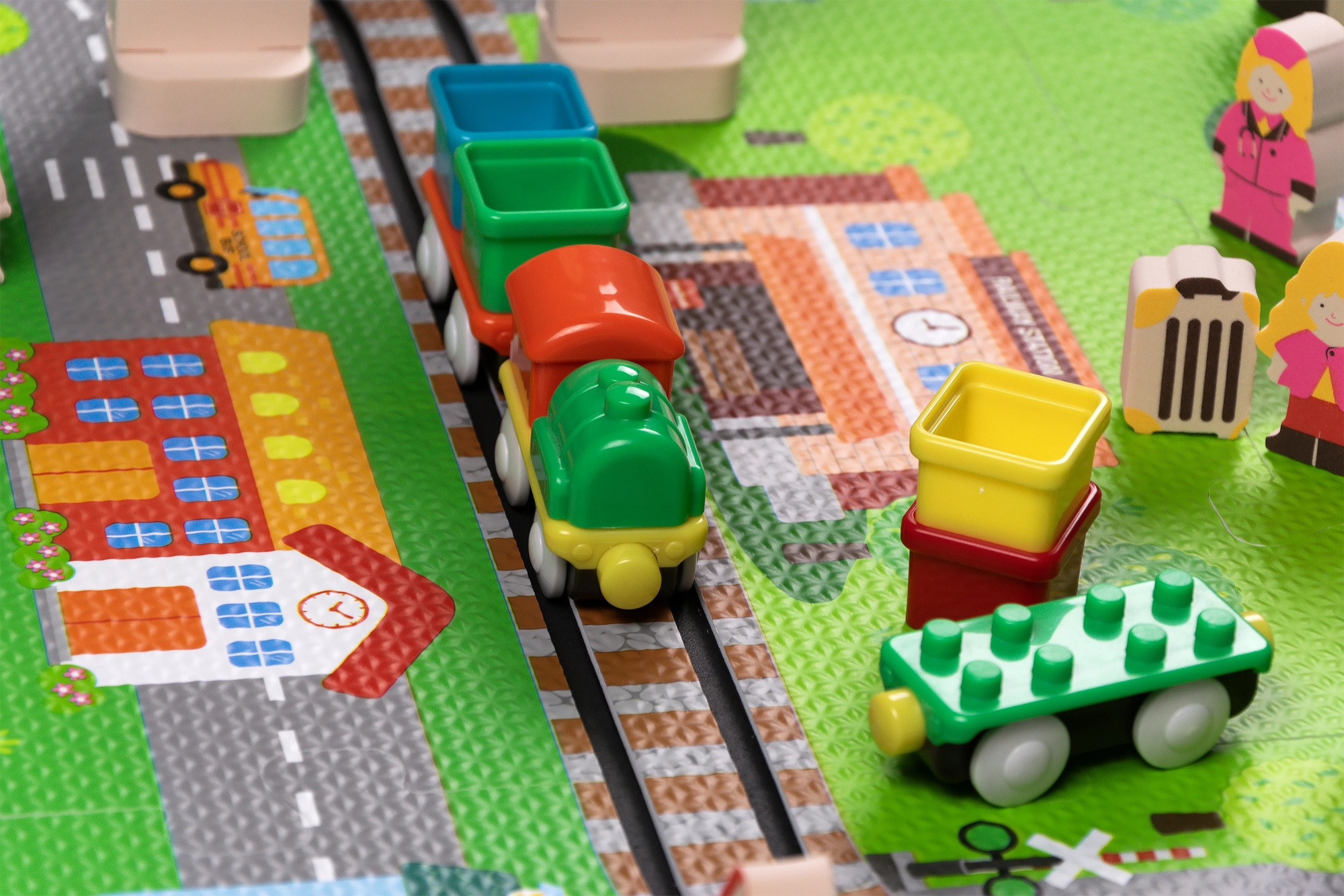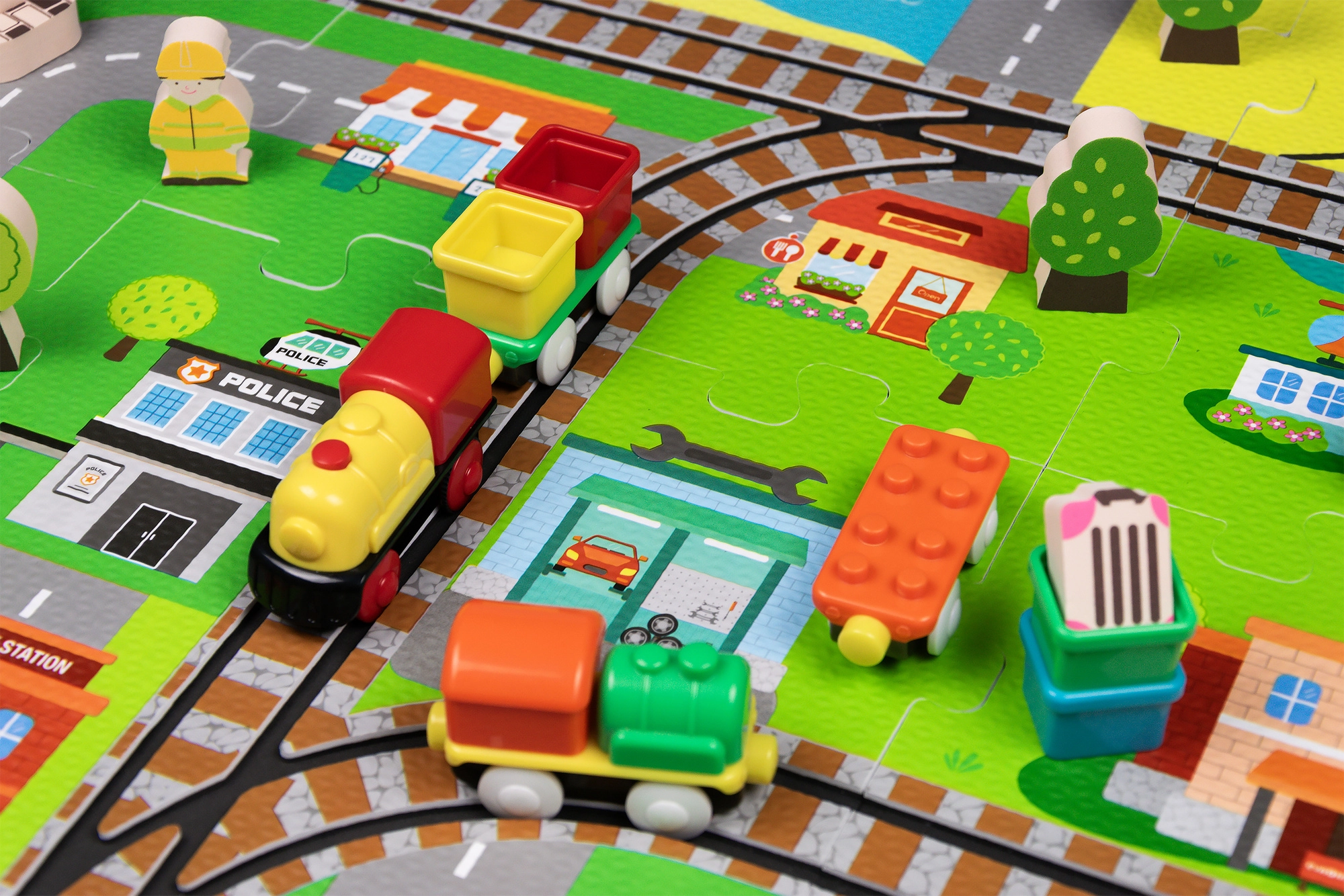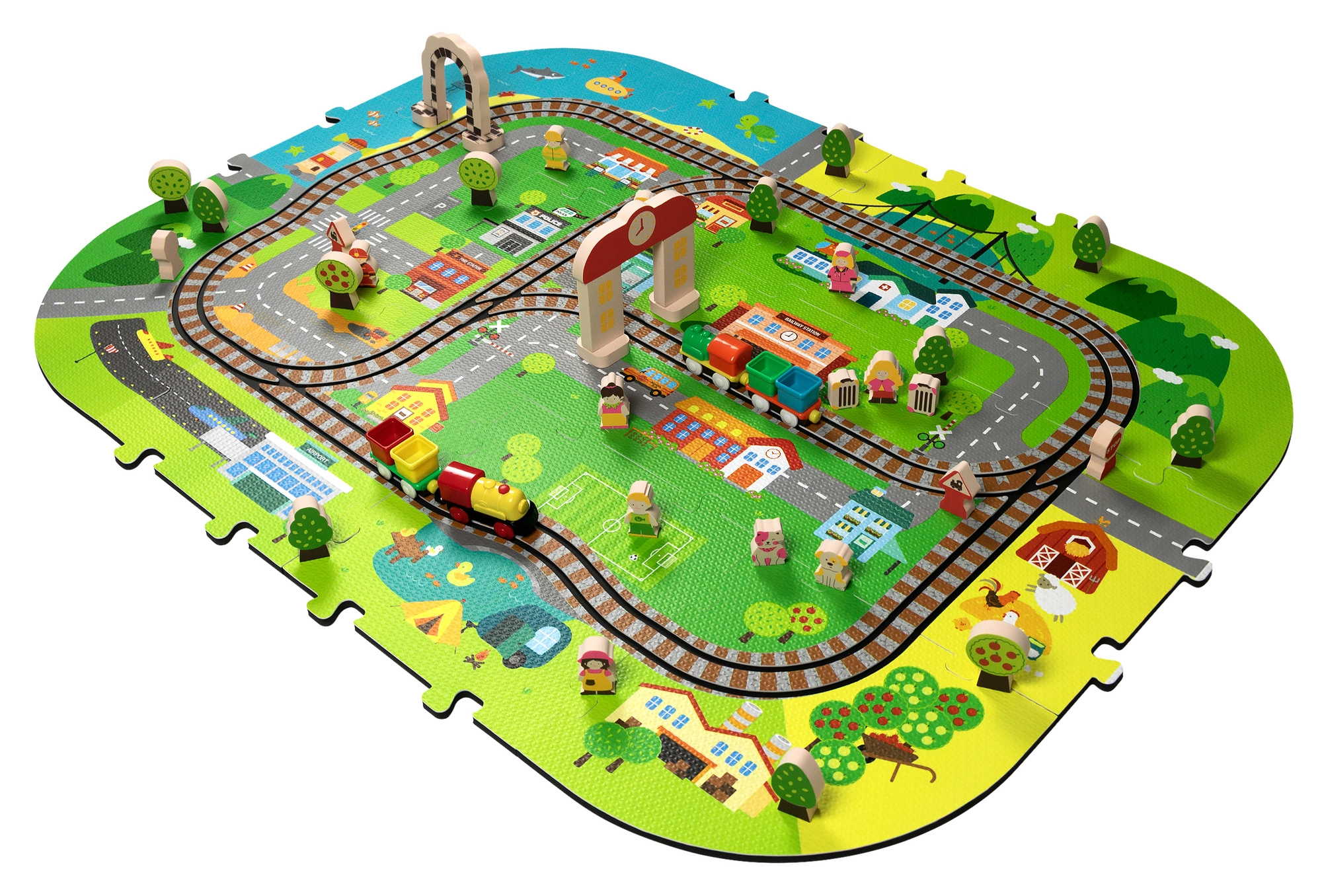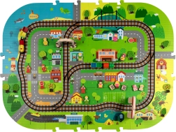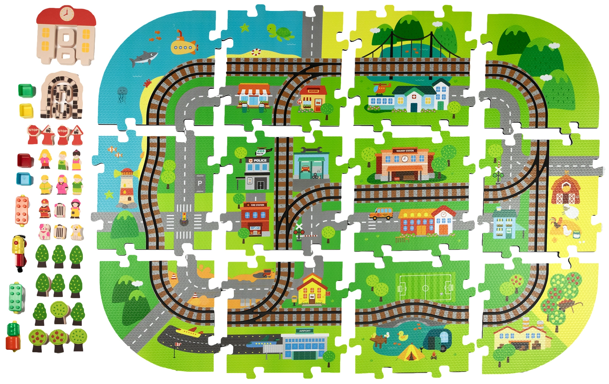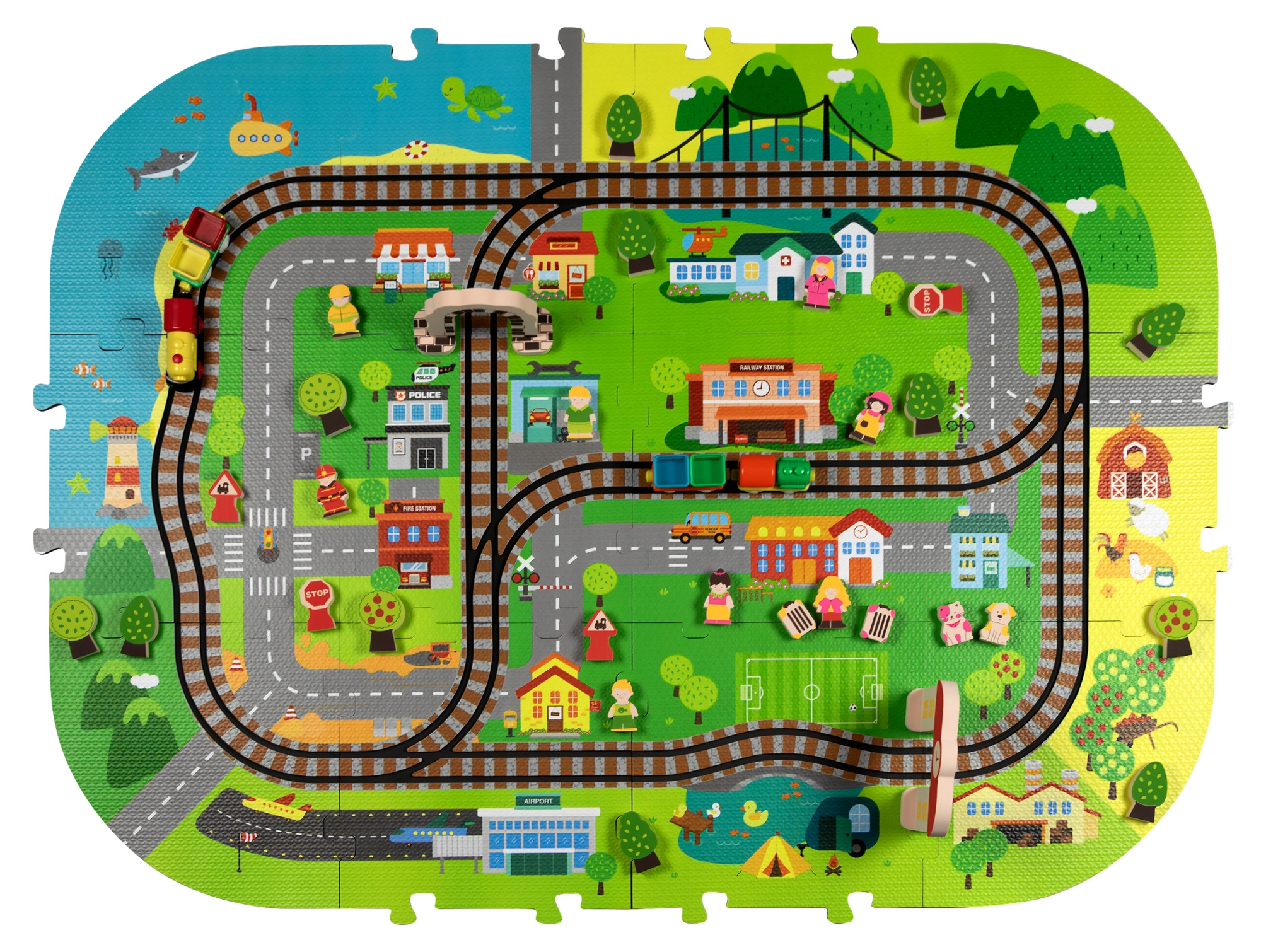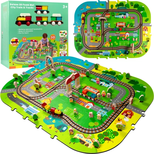 Ta ustvarjalni komplet združuje mehko talno podlogo z 3D mestom in železniško progo. Otroci si sestavijo pisano sceno z ulicami, stavbami, letališčem, kmetijo, morjem, kampom in gorami ter pustijo, da baterijska lokomotiva gladko vozi po sestavljeni progi. Trdni penasti deli EVA blažijo udarce, izolirajo pred mrazom in ustvarjajo varno mesto za igro.