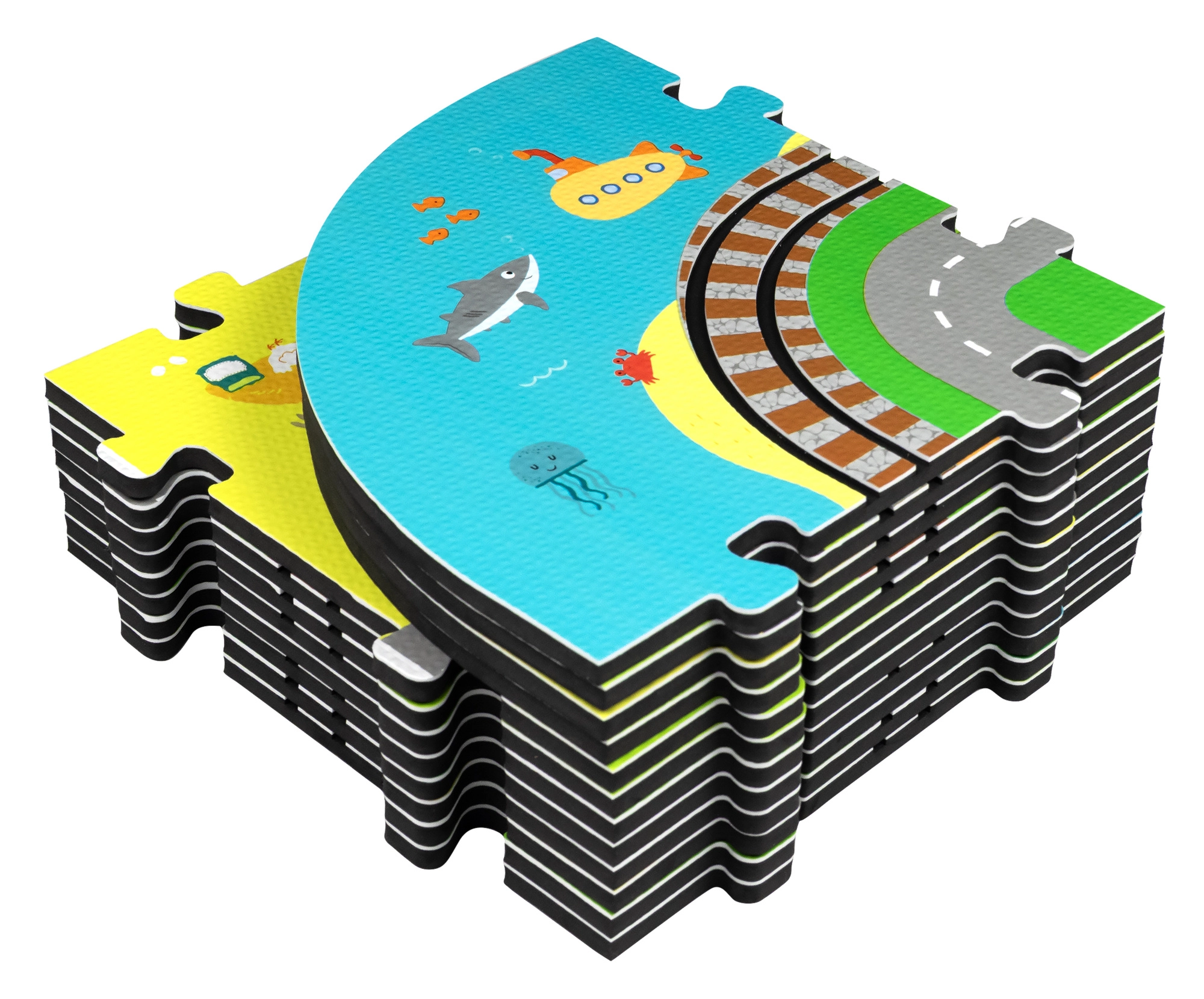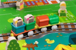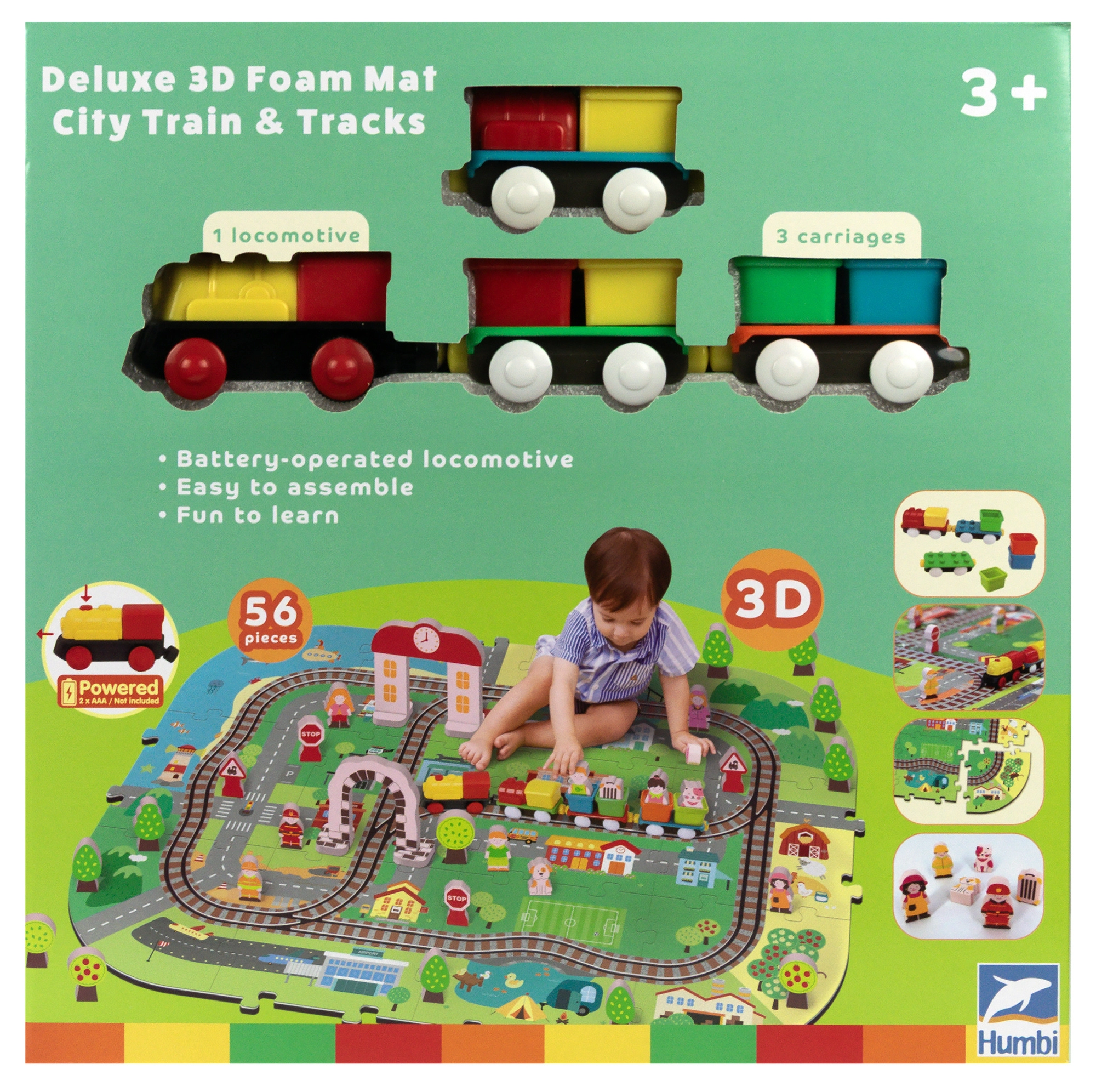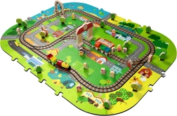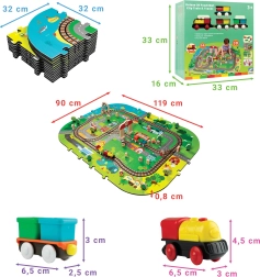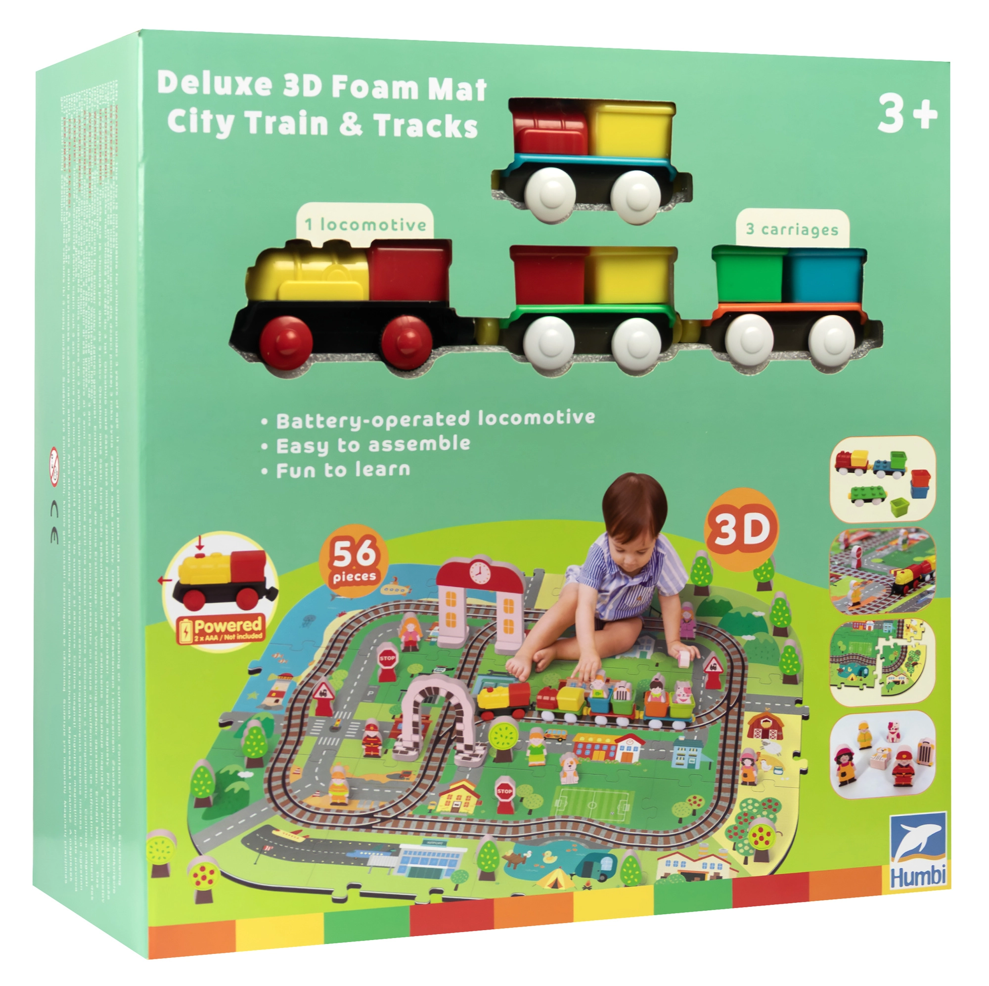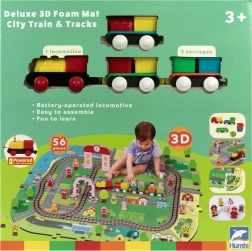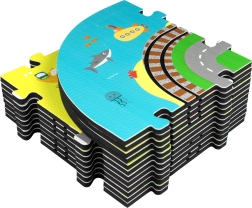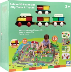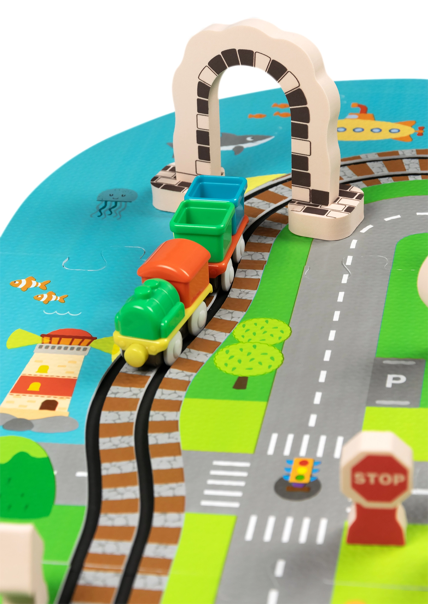Ta ustvarjalni komplet združuje mehko talno podlogo z 3D mestom in železniško progo. Otroci si sestavijo pisano sceno z ulicami, stavbami, letališčem, kmetijo, morjem, kampom in gorami ter pustijo, da baterijska lokomotiva gladko vozi po sestavljeni progi. Trdni penasti deli EVA blažijo udarce, izolirajo pred mrazom in ustvarjajo varno mesto za igro.