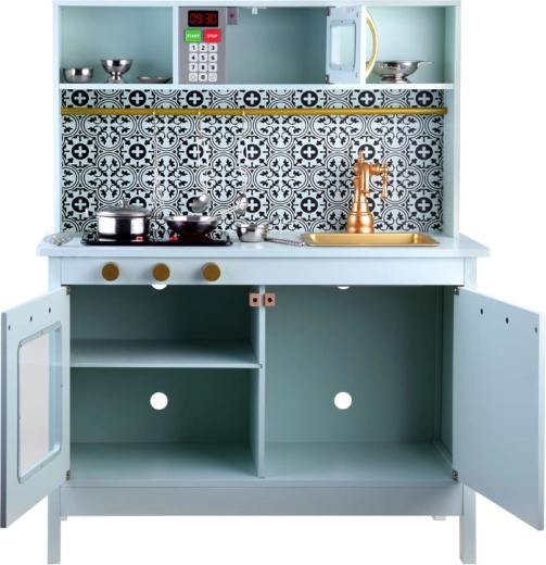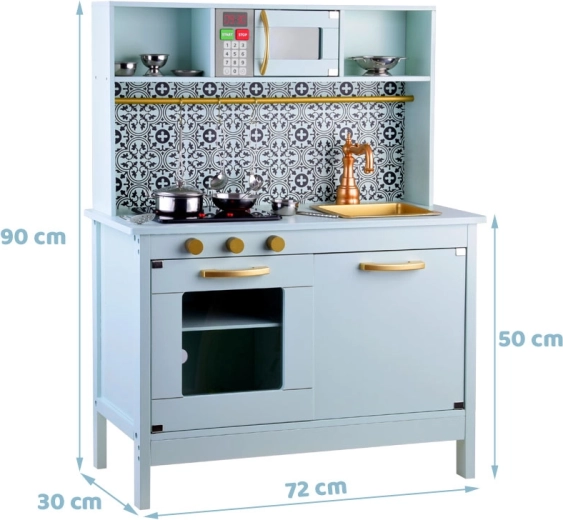 Ta elegantna otroška kuhinjica v metini barvi s črno-belo mozaiko izstopa po kakovostni izdelavi iz lesa in MDF. Realistični elementi, kot so indukcijska kuhalna plošča s svetlobo in zvokom, mikrovalovna pečica in pečica s prozornimi vratci, otroke popeljejo v svet domišljije in igre vlog.