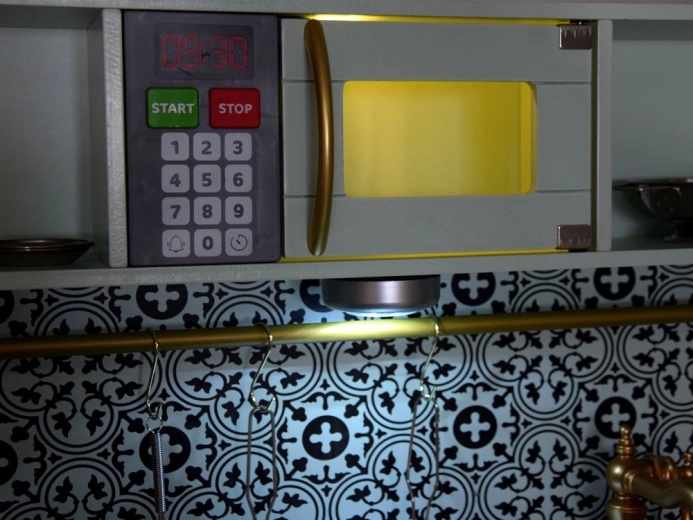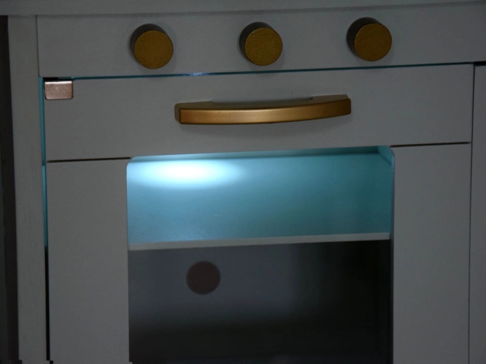 Sestavni del je zlato korito z vintage armaturo, zlate krmilne gumbe in ročaje ter praktična palica za obešanje pripomočkov. Bogat komplet nerjavnih dodatkov (lonec s pokrovko, kozica, cedilo, skledice, krožnički, pribor in pripomočki) otrokom omogoča serviranje in “kuhanje” kot v pravi kuhinji.