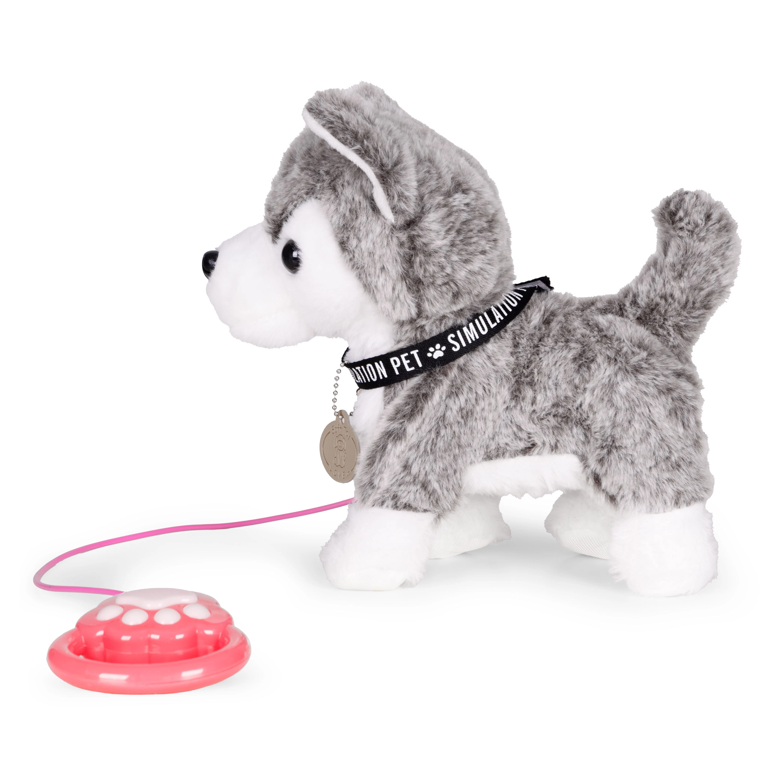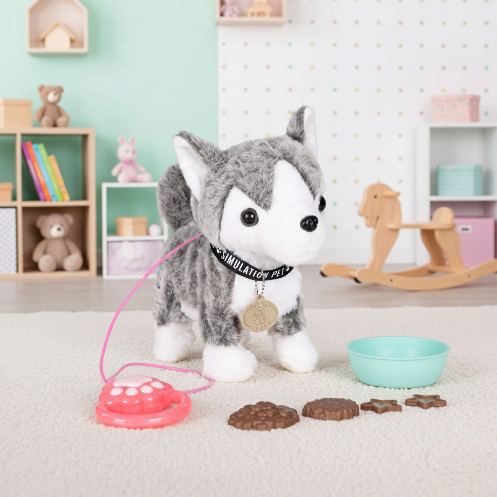 - Plišasti kužek husky, upravljalnik na povodcu, posodica, plastični priboljški