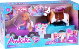 Podajte se na podeželske dogodivščine z igralnim setom Woopie, kjer punčka Niki vozi vijolični terenski avto in prevaža konja na turkizni prikolici. Punčka ima dolge blond lase za česanje, konj je opremljen s sedlom in uzdo. Idealna igrača za razvoj domišljije in ustvarjalnosti otrok od 3 let.