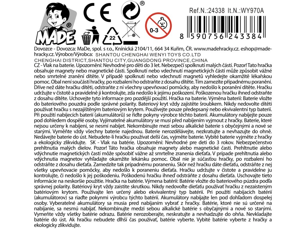 Dva zglobno povezana vagona s prosto vrtečimi se kolesi omogočata gladko vožnjo po ravnih površinah in otroških tirnicah. Zahvaljujoč trpežni plastiki in napajanju z 3× AG13 je igrača pripravljena na dolgotrajno igranje. Idealno za male ljubitelje vlakov, ki radi odkrivajo svet železnic in razvijajo svojo domišljijo.
