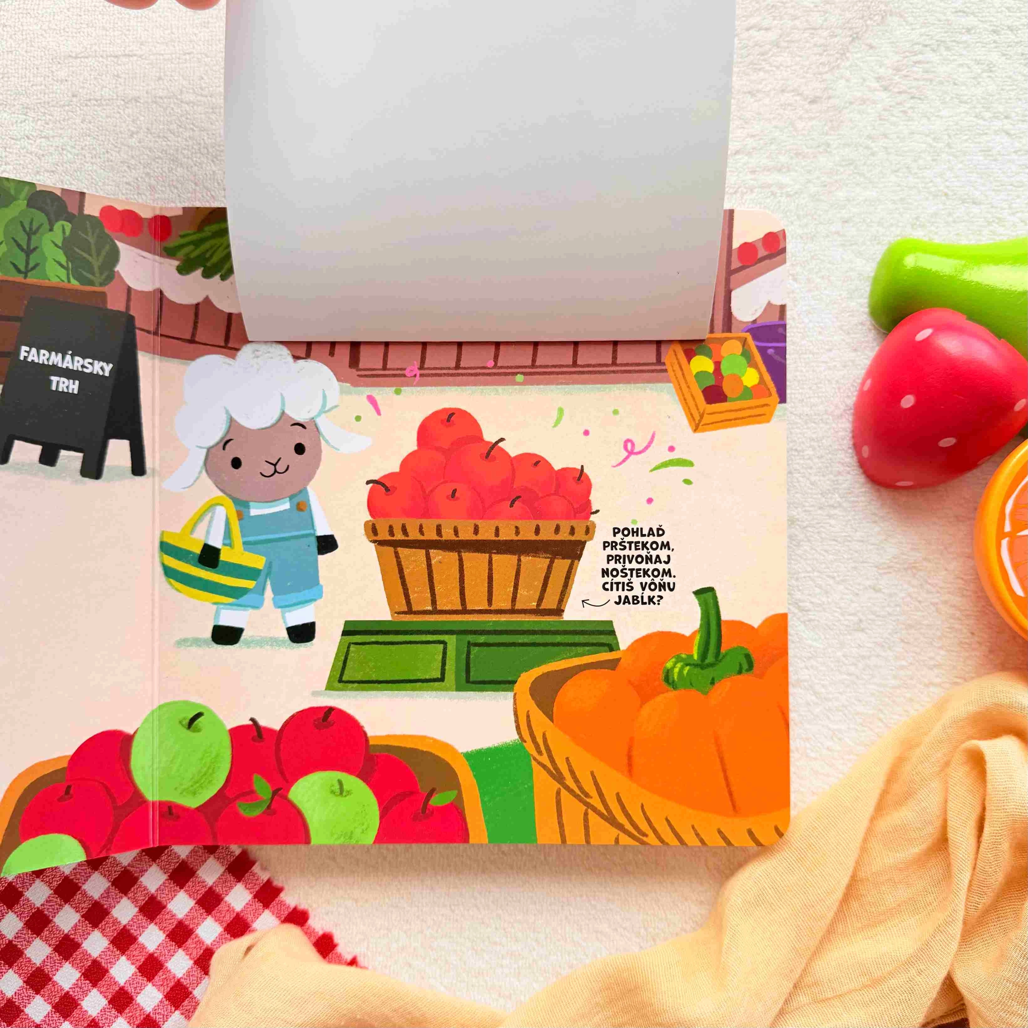 Dišeča knjiga Nakupovanje na kmečki tržnici popelje otroke v svet barv, okusov in vonjev. Na vsaki dvojni strani je skrit avtentičen vonj sadja ali zelenjave, ki se aktivira z nežnim dotikom in povonjanjem. Otroci tako vključijo voh in dotik, branje pa postane čutno raziskovanje.