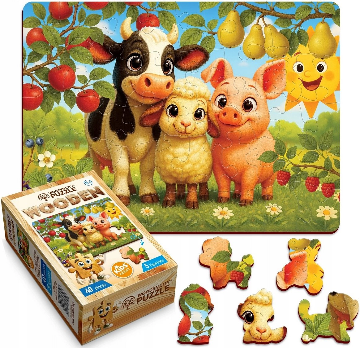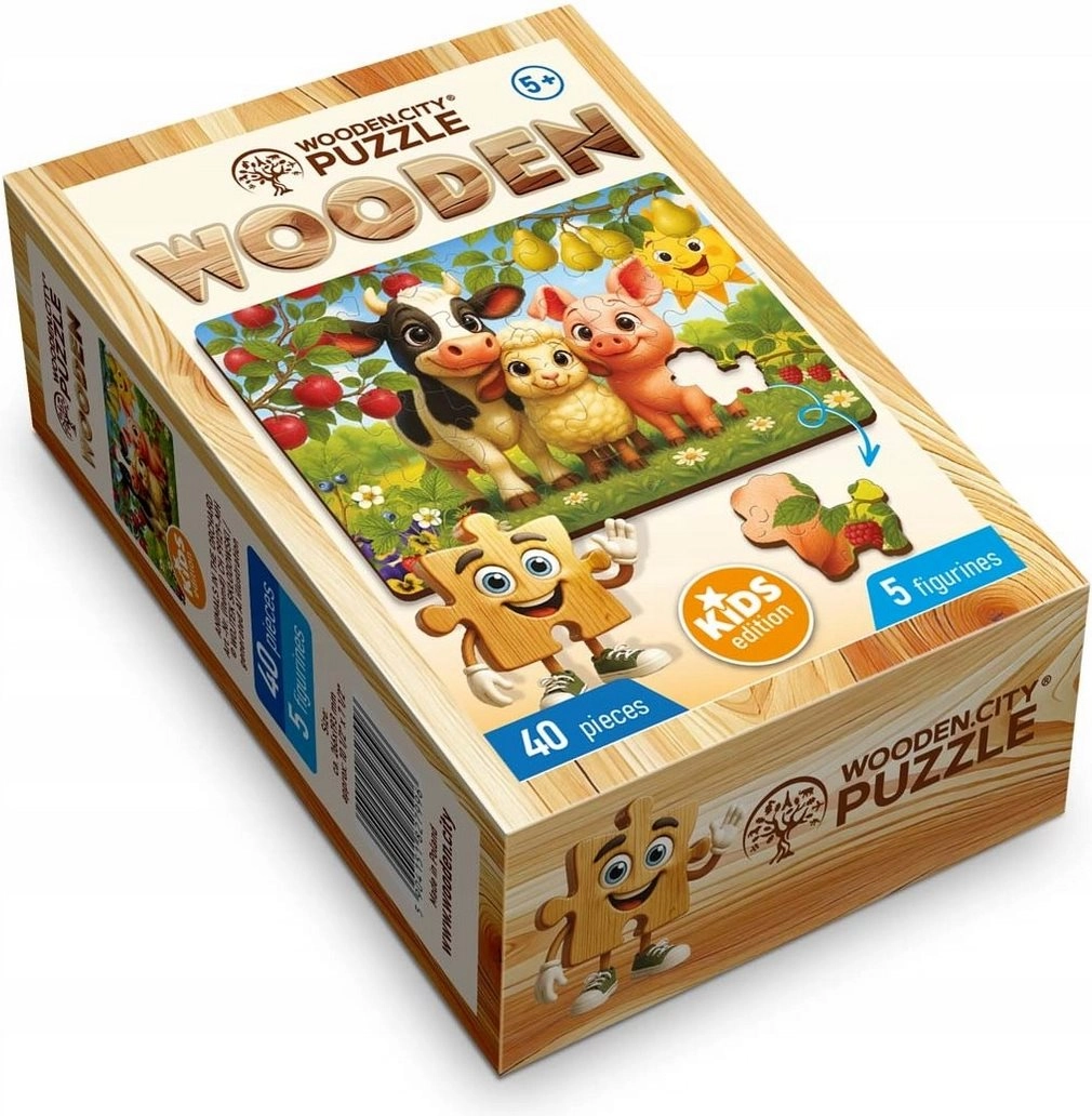 Lesene sestavljanke WOODEN CITY združujejo zabavo in učenje v enem. Zahvaljujoč natančni laserski obdelavi imajo kosi popolnoma gladke robove brez trsk, odlično se prilegajo in ustvarijo barvito prizorišče z živalmi s kmetije. Priložena je tudi samostojna predloga za udobno sestavljanje.