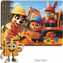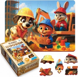 Lesene puzzle WOODEN CITY Vesela ekipa prinašajo otrokom zabavno sestavljanje s kakovostno izvedbo in prijetnim lesenim materialom. Zahvaljujoč 40 trpežnim kosom in 5 posebnim oblikam otroci urijo fino motoriko ter logično mišljenje in hkrati uživajo v barviti sceni z ljubkimi živalskimi gradbeniki.