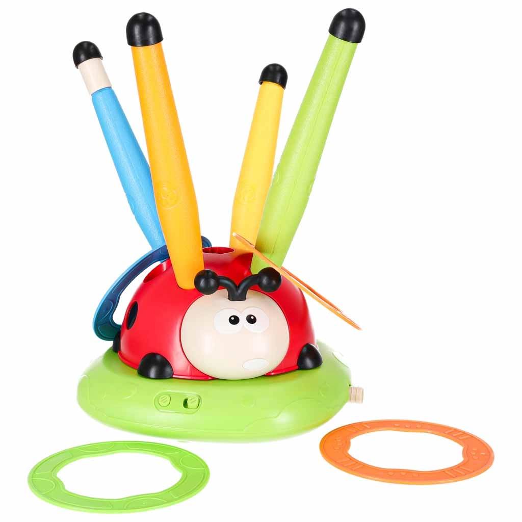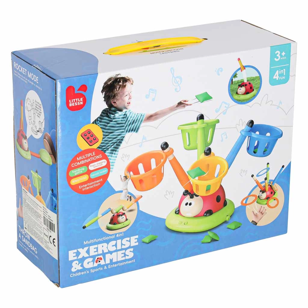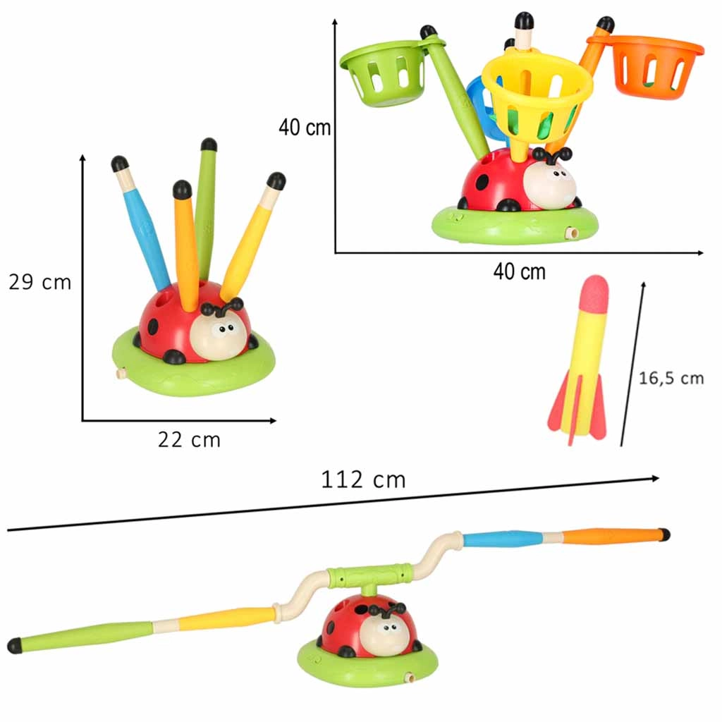 Igra, ki ne pusti sedeti: vrteča se skakalna ovira preizkusi odzivnost, zračni izstreljevalnik izstreli rakete v zrak, met na cilj pa doda kanček športnega tekmovanja. Interaktivna pikapolonica z lučmi in zvoki motivira k gibanju in vsako rundo spremeni v nov izziv.