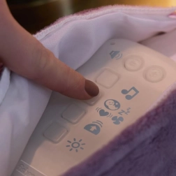 Nežno žareč trebušček ter izbor melodij, naravnih zvokov in belega šuma pomagajo dojenčku, da se umiri in lažje zaspi.