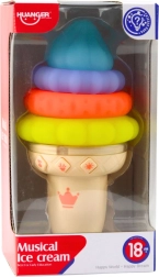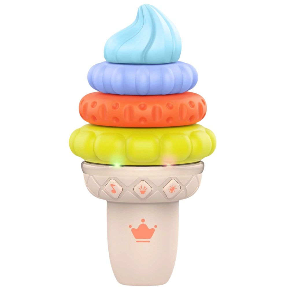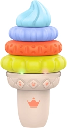 Ta glasbena izobraževalna sladoledna igrača je odlična izbira za prvo odkrivanje sveta skozi igro. Barvni, mehki in elastični deli z različnimi teksturami vabijo k prijemanju, stiskanju in zlaganju v poljubnem vrstnem redu, s čimer spodbujajo logično razmišljanje in razvoj fine motorike. Vgrajene LED diode in prijetne melodije pritegnejo otrokovo pozornost ter podpirajo senzorično stimulacijo.