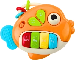 Glasbeni klavirček ribica je idealna prva glasbena igrača za malčke. Štiri jasno označene tipke Do, Re, Mi, Fa ob pritisku predvajajo vesele melodije in posamezne tone, s čimer naravno razvijajo občutek za ritem in zaznavanje zvoka. Ergonomska oblika ribice se odlično prilega majhni roki, lahko ohišje ter gladki, zaobljeni robovi zagotavljajo varno in udobno uporabo.