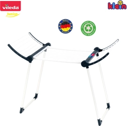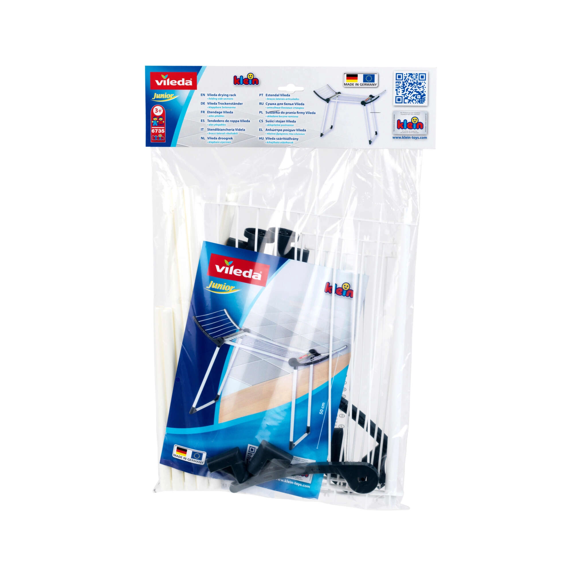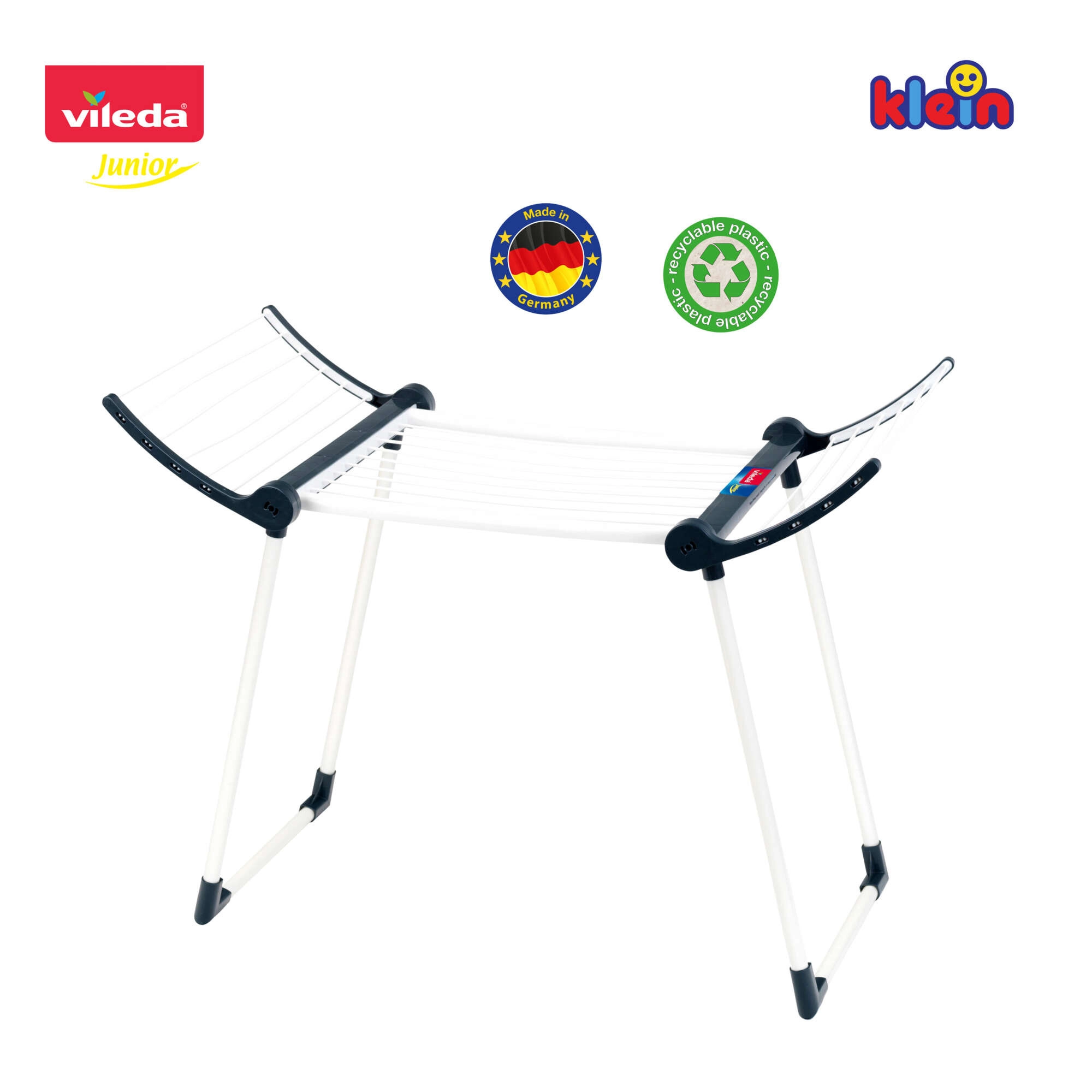 Otroško stojalo za sušenje perila Vileda z licenco VILEDA prinaša realističen domači doživljaj v varni obliki za male pomočnike. Idealno je za sušenje oblačil za punčke in tudi lahkega otroškega perila ter spodbuja razvoj samostojnosti in posnemanje odraslih.