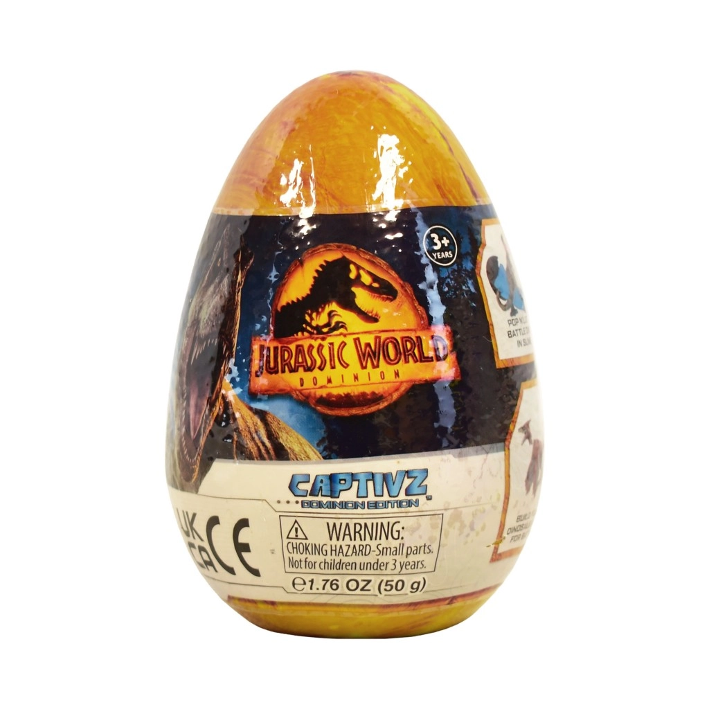 Doživite vznemirjenje odkrivanja s skrivnostnim jajcem s sluzom JURASSIC WORLD. Vsako jajce skriva sestavljivo figurico dinozavra, skrito v edinstveni sluzi (najpogosteje jantarni ali BioSyn Lab), bojni žeton in zbirateljskega vodiča. Figure so navdihnjene s filmom Jurski svet: Nadvlada in bodo razveselile oboževalce vseh starosti.