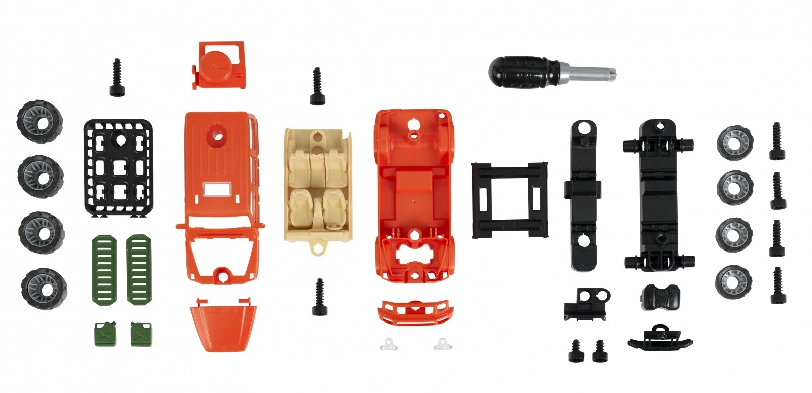 Zahvaljujoč sistemu vijakov in priloženemu orodju si otroci avto sestavijo sami, preizkusijo delo malega mehanika in razumejo osnovna načela konstrukcije.