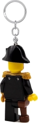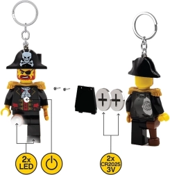 Podrobna minifigurica s tricorne klobukom, epoletami in piratskimi elementi ostaja zvesta LEGO slogu ter izstopa na ključih in nahrbtniku.