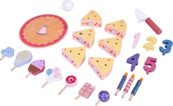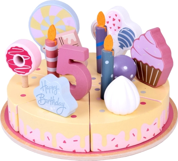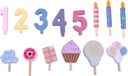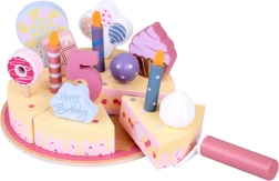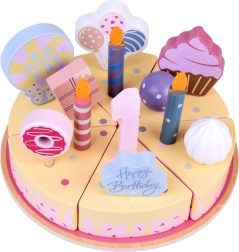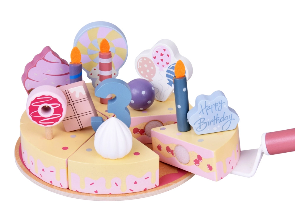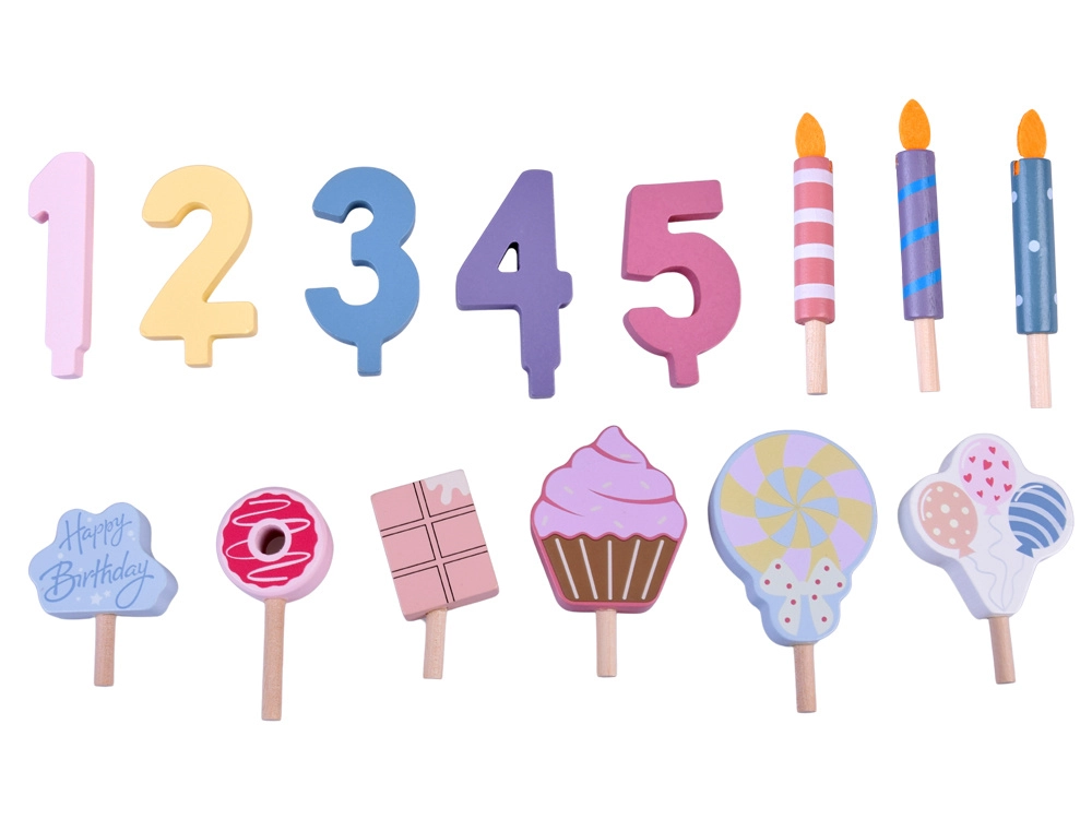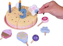 Ustvarite svojo rojstnodnevno pogostitev! Lesena torta je sestavljena iz 6 kosov, ki jih lahko »odrežete« in znova sestavite, ter okrasite z zamenljivimi svečkami, številkami in sladkarijami. Komplet je idealen za skupinsko igro, učenje barv, štetje in vadbo vljudne postrežbe.