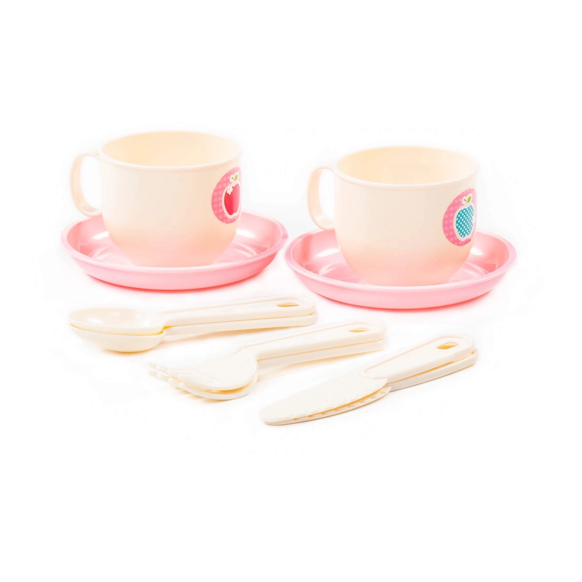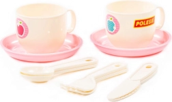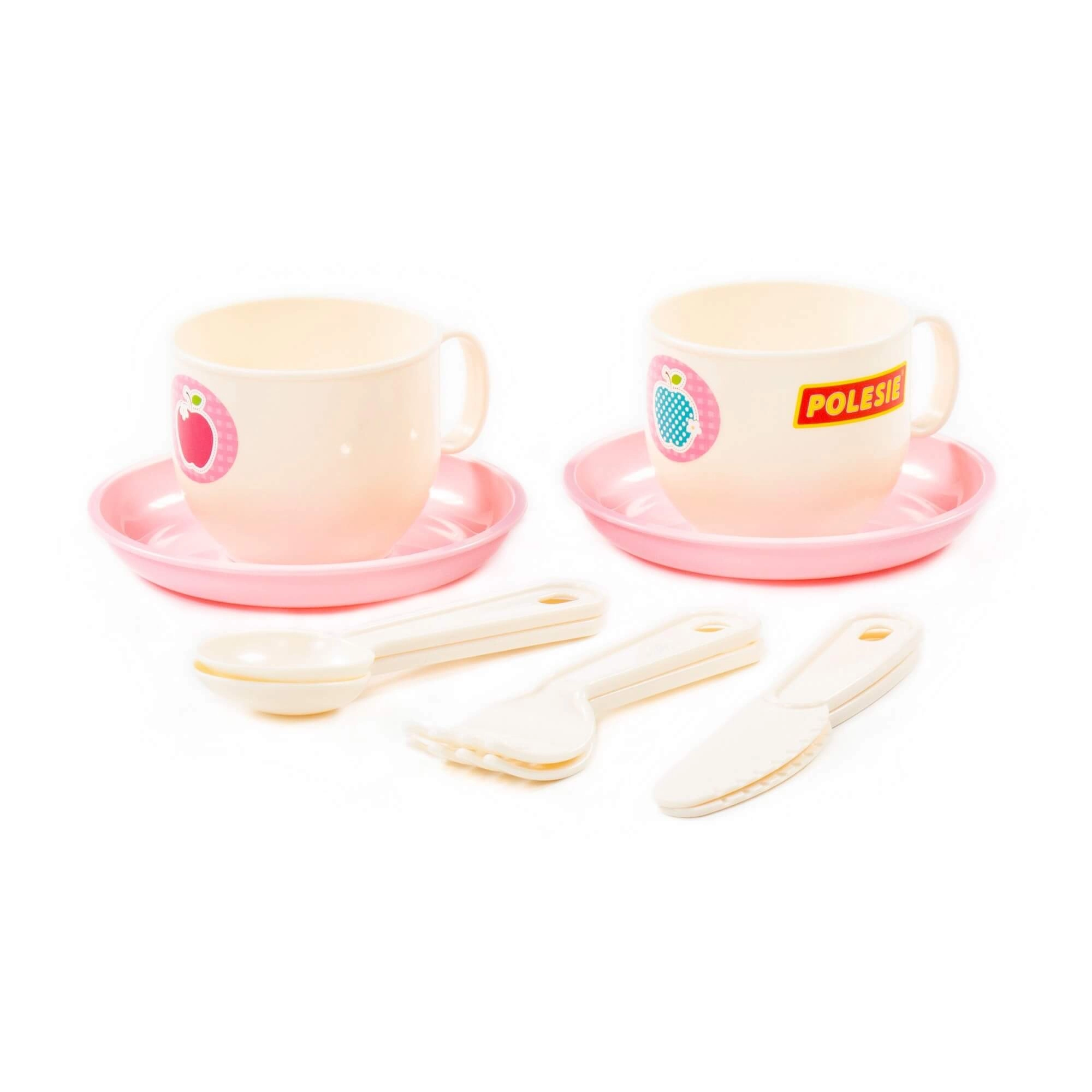 Dve skodelici z rožnatimi krožnički in priborom omogočata otrokom, da strežejo kot pravi gostitelji.
