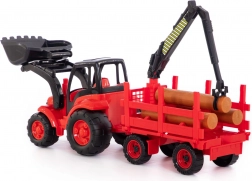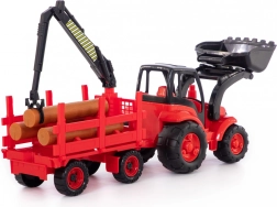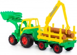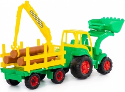 Ta barvit traktor z velikimi kolesi in prikolico za hlode je idealen za ustvarjalno igro doma in na igrišču. Otroci lahko s premično sprednjo lopato zajemajo material, z žerjavom s prijemalom na prikolici pa prelagajo in nalagajo lesene hlode. Trpežna plastična izvedba zagotavlja dolgo življenjsko dobo in varno igranje.