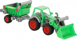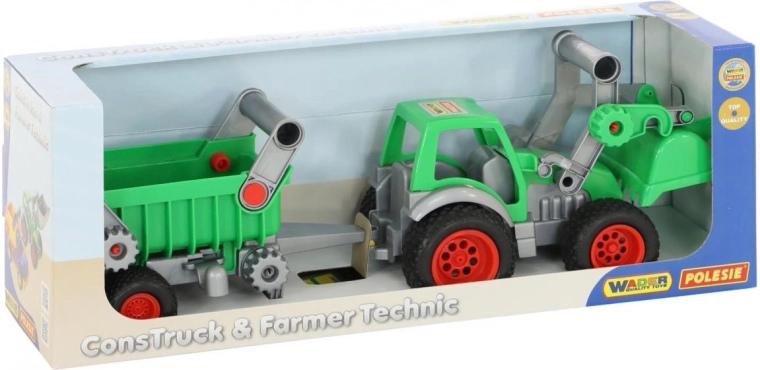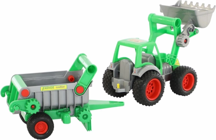 Ta kakovosten traktor z nakladalnikom in snemljivo prikolico otrokom prinaša realistične funkcije in dolgo življenjsko dobo. Mehansko dviganje in izpraznjevanje lopate z zaklepom transportnega položaja razvija fino motoriko, medtem ko nagibna prikolica z izpustnim zadnjim delom olajša nakladanje in razkladanje “tovora”.