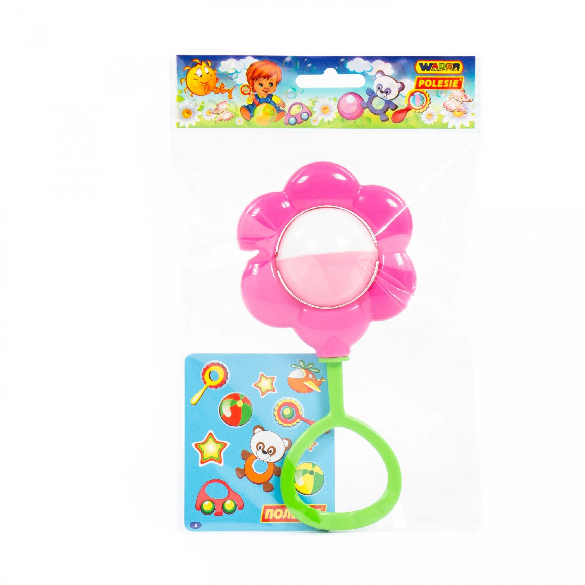 Vrteča se kroglica na sredini cveta ustvarja prijeten zvok in barvito gibanje, ki pritegne in spodbuja otrokove čute.