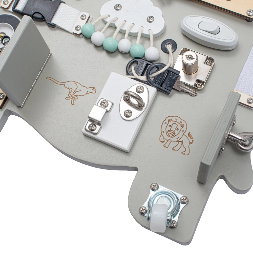 Ta izobraževalna Montessori aktivna deska otrokom prinaša resnične dražljaje iz vsakdanjega življenja in jih motivira k samostojnemu odkrivanju. Eleganten slonji dizajn se odlično poda v vsak interier, trden les pa prenese tudi intenzivno uporabo.