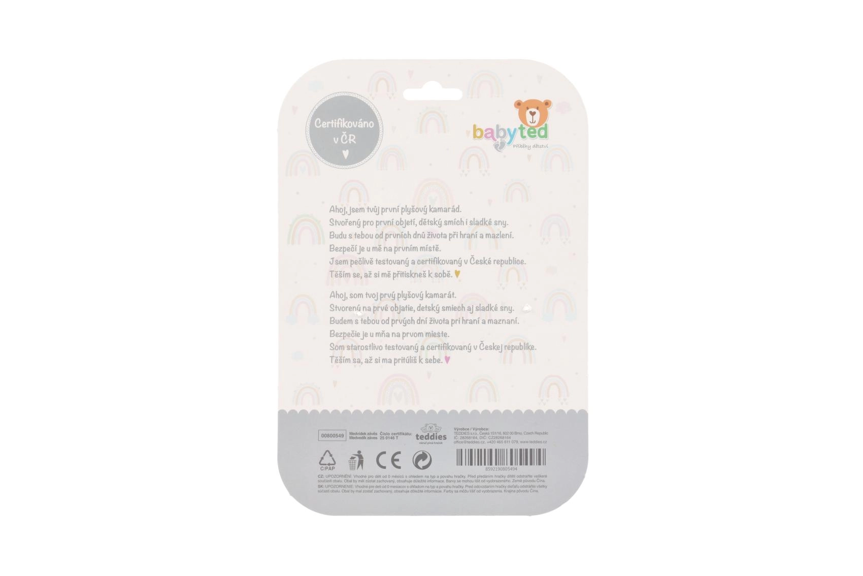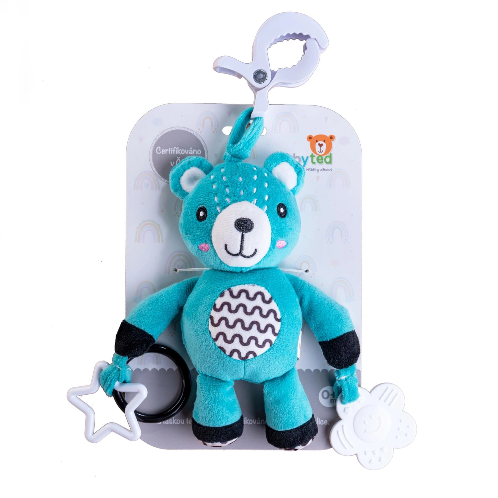 Igrača je certificirana v Češki republiki, izpolnjuje stroge varnostne standarde in je primerna za novorojenčke. Zaradi lahke zasnove in vzdržljive sponke je idealen spremljevalec na potovanjih in za vsakodnevno igro.