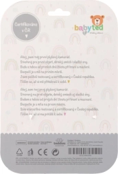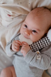 Spodnje grizalo v obliki rožice je nežno do dlesni in pomaga pri izraščanju prvih zobkov. Kontrastni črno-beli vzorec podpira vizualni razvoj najmlajših. Mehek, varen pliš je prijeten na dotik in primeren od rojstva. Izdelek je certificiran v RS, izpolnjuje visoke varnostne standarde in je odlično darilo za dojenčke 0m+.