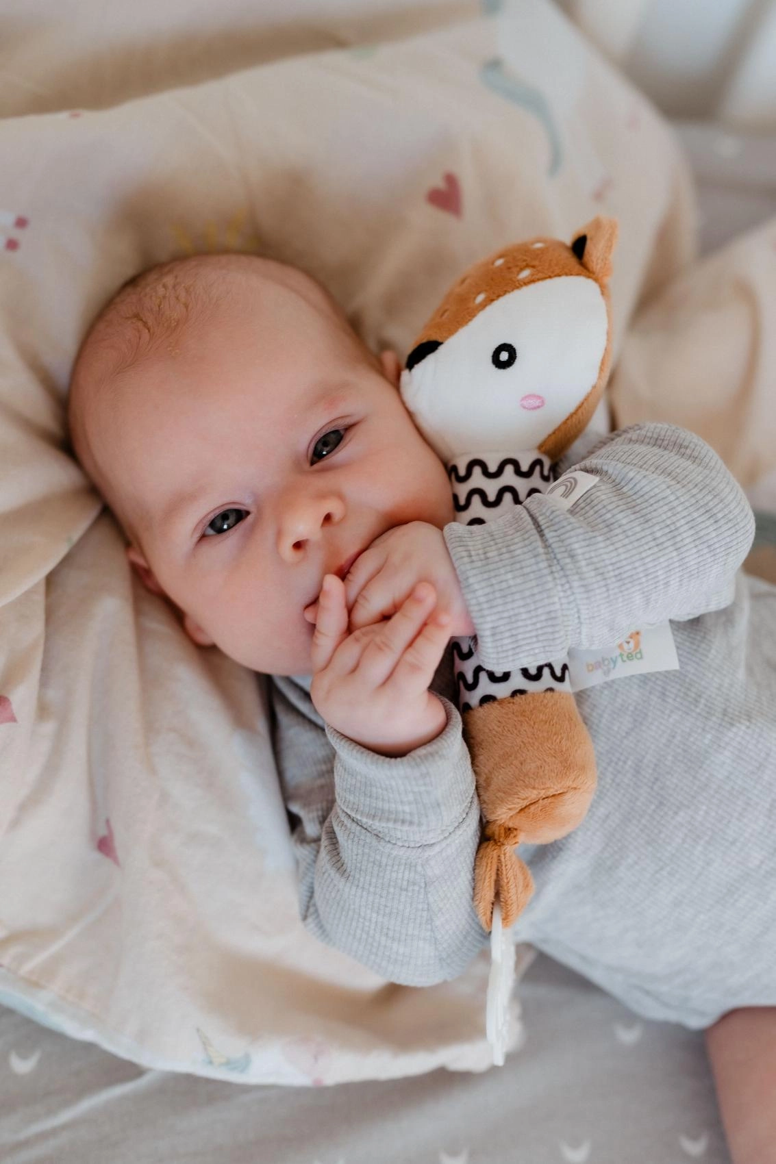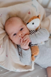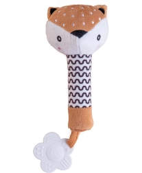 Ljubko plišasto piskalo in grizalo v obliki srnice je idealna prva igrača za dojenčke že od rojstva. Zahvaljujoč mehkemu telescu ga je enostavno držati v majhnih rokicah, ob stisku odda nežen piskajoč zvok za razvoj sluha, na koncu pa ima grizalo v obliki rožice, ki lajša občutljive dlesni. Kontrastni črno-beli vzorec podpira vizualno zaznavanje, varni, mehki materiali pa so primerni od 0m+.