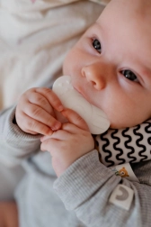 Mehko grizalo v obliki rožice nežno masira občutljive dlesni in pomaga pri rasti prvih zobkov.