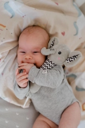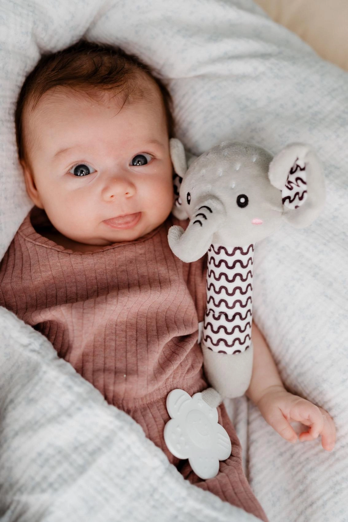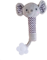 Plišasti slon s piskalom in grizalom je idealna prva igrača za novorojenčke. Zaradi ergonomske, podolgovate oblike se zlahka drži tudi v drobnih ročicah, nežen pisk spodbuja sluh in pritegne pozornost dojenčka. Mehak, varen material nudi prijeten dotik in pomirjujoč občutek pri cartanju.