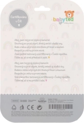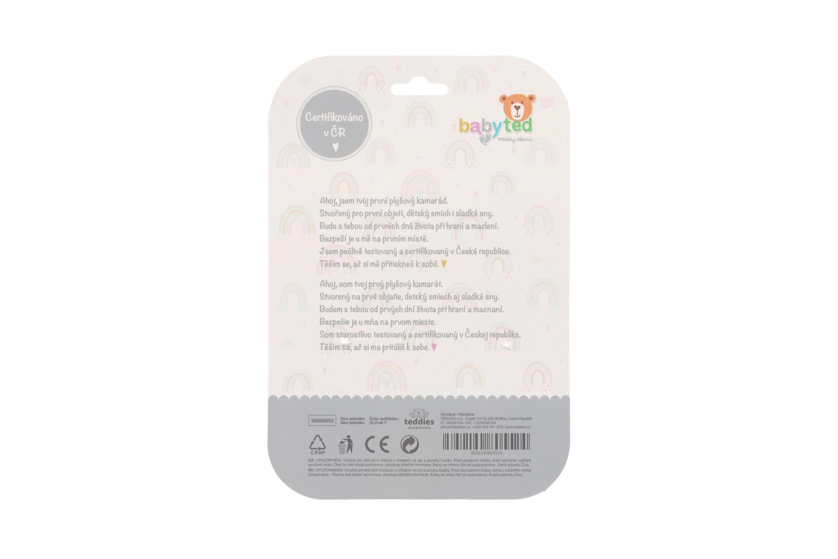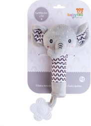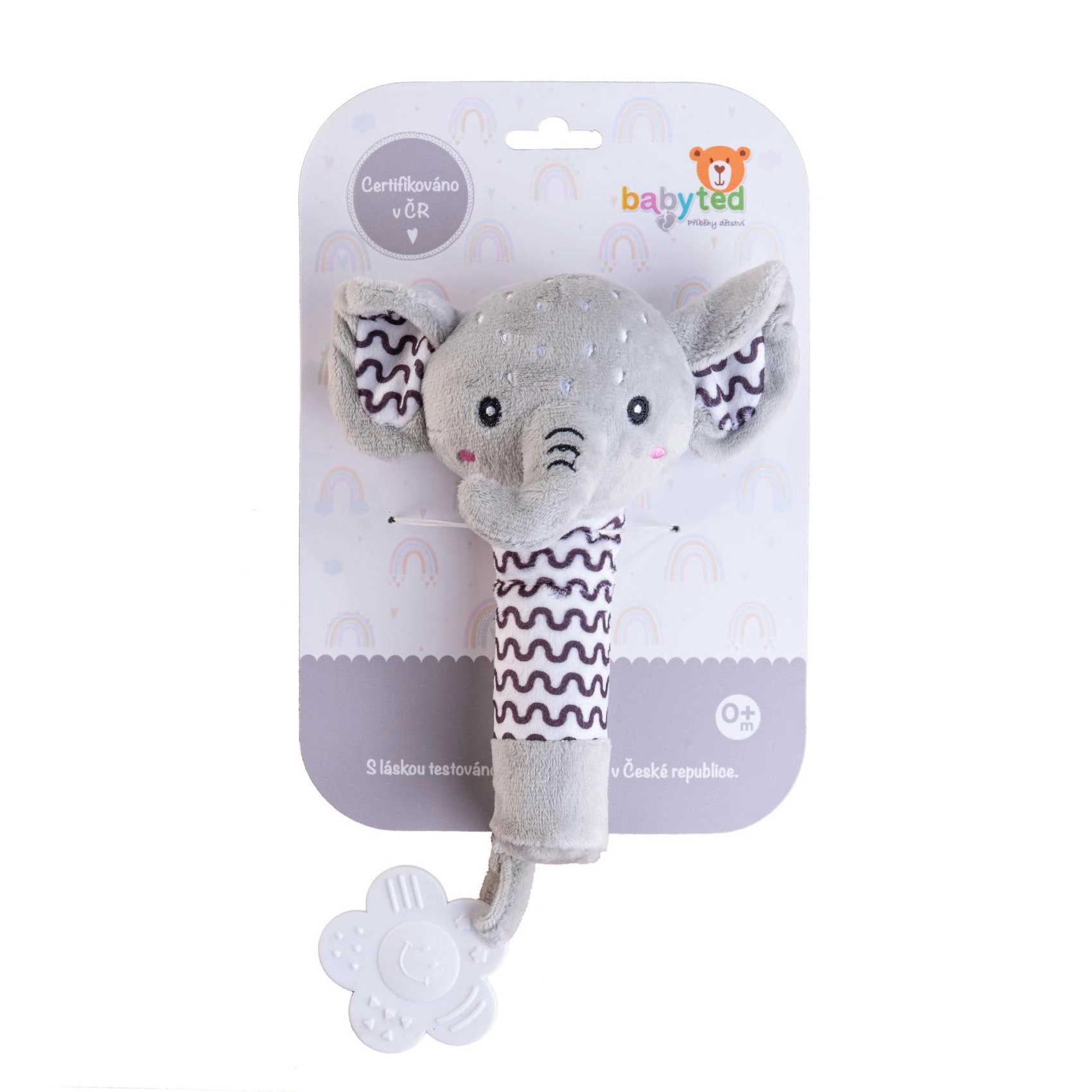 Ljubko plišasto piskalo in grizalo v obliki slona znamke BABYTED razveseli dojenčke že od rojstva. Ima mehko telo za enostaven oprijem, ob stisku nežno zapiska, na koncu držala pa je mehko grizalo v obliki rožice za olajšanje občutljivih dlesni. Kontrastni vzorci podpirajo vizualno zaznavanje, varen, mehak pliš pa je nežen do najmlajših. Certificirano v Češki republiki po strogih varnostnih standardih.